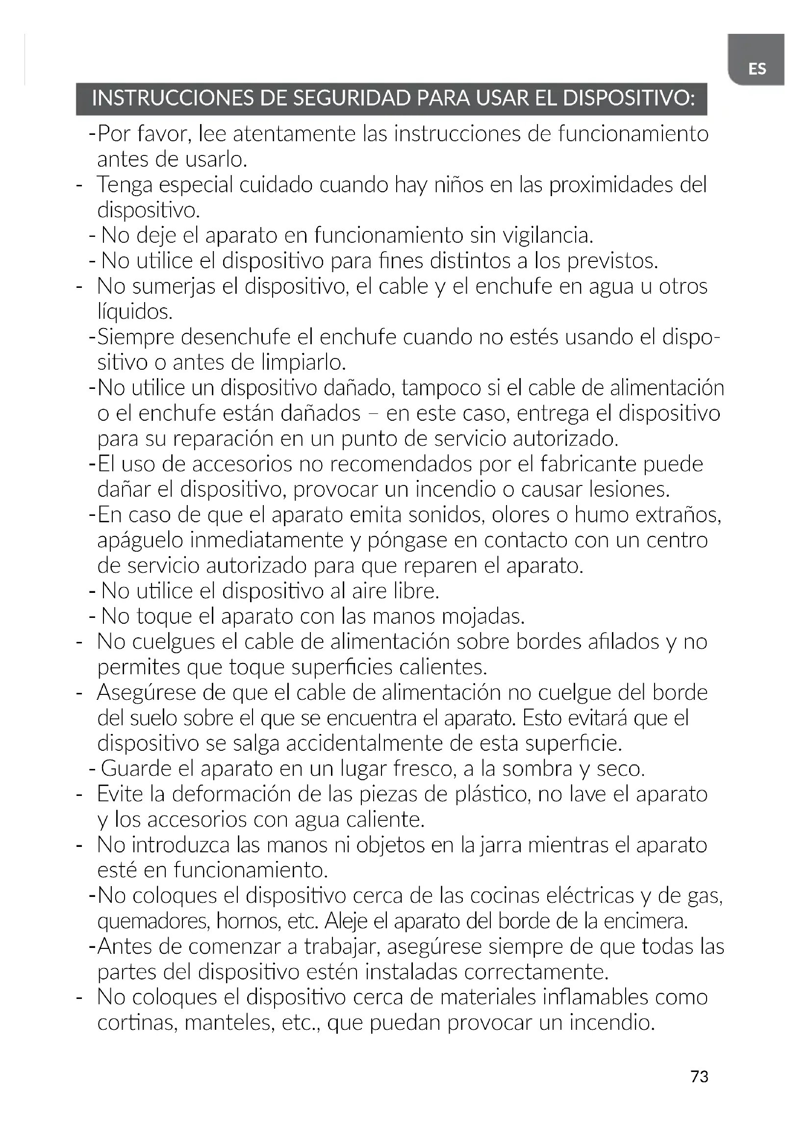 Por favor, lee atentamente las instrucciones de funcionamiento antes de usarlo. - Tenga especial cuidado cuando hay niños en las proximidades del disposivo. - No deje el aparato en funcionamiento sin vigilancia. - No ulice el disposivo para nes disntos a los previstos. - No sumerjas el disposivo, el cable y el enchufe en agua u otros líquidos.