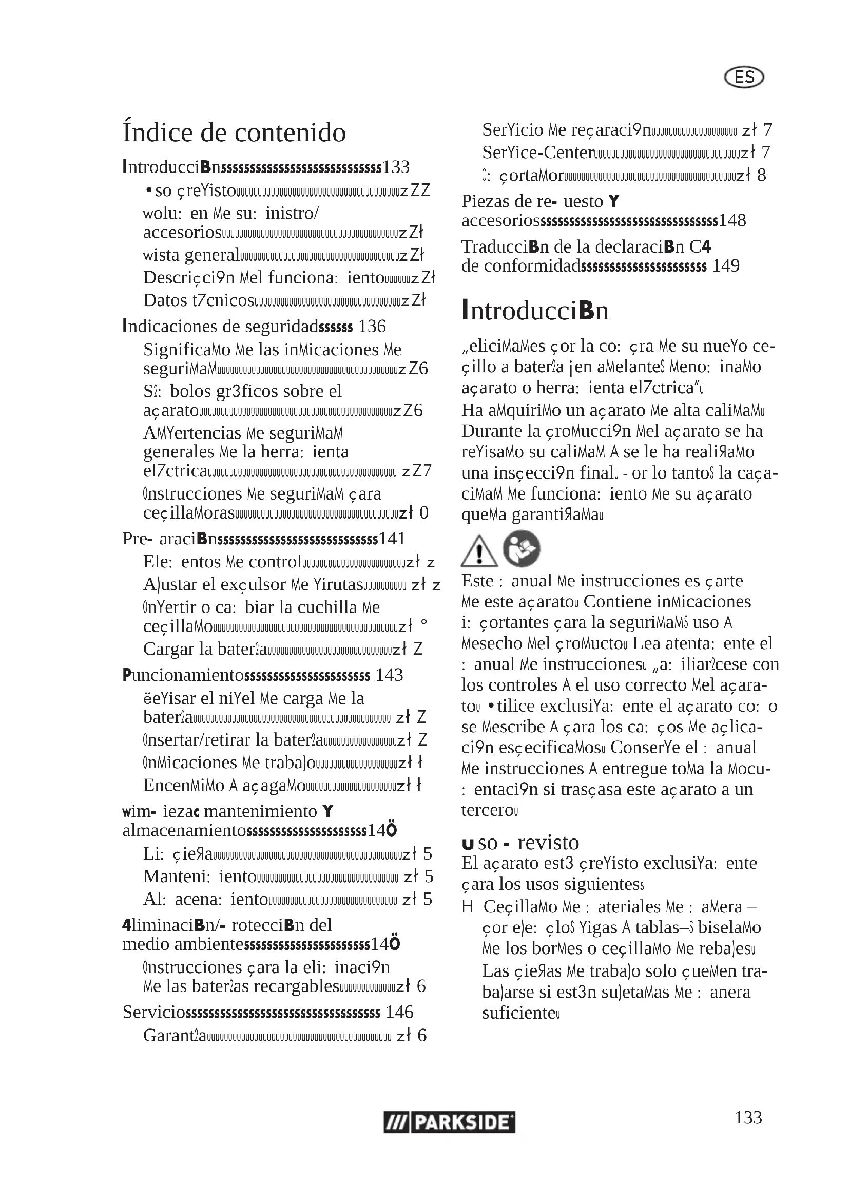 - Traducción de la declaración CE de conformidad Introducción Felicidades por la compra de su nuevo ce- pillo a batería (en adelante, denominado aparato o herramienta eléctrica). Ha adquirido un aparato de alta calidad. Durante la producción del aparato se ha revisado su calidad y se le ha realizado una inspección final. Por lo tanto, la capa- cidad de funcionamiento de su aparato queda garantizada. Este manual de instrucciones es parte de este aparato. Contiene indicaciones importantes para la seguridad, uso y desecho del producto. Lea atentamente el manual de instrucciones. Familiarícese con los controles y el uso correcto del apara- to. Utilice exclusivamente el aparato como se describe y para los campos de aplica- ción especificados. Conserve el manual de instrucciones y entregue toda la docu- mentación si traspasa este aparato a un tercero. Uso previsto El aparato está previsto exclusivamente para los usos siguientes: p. 149