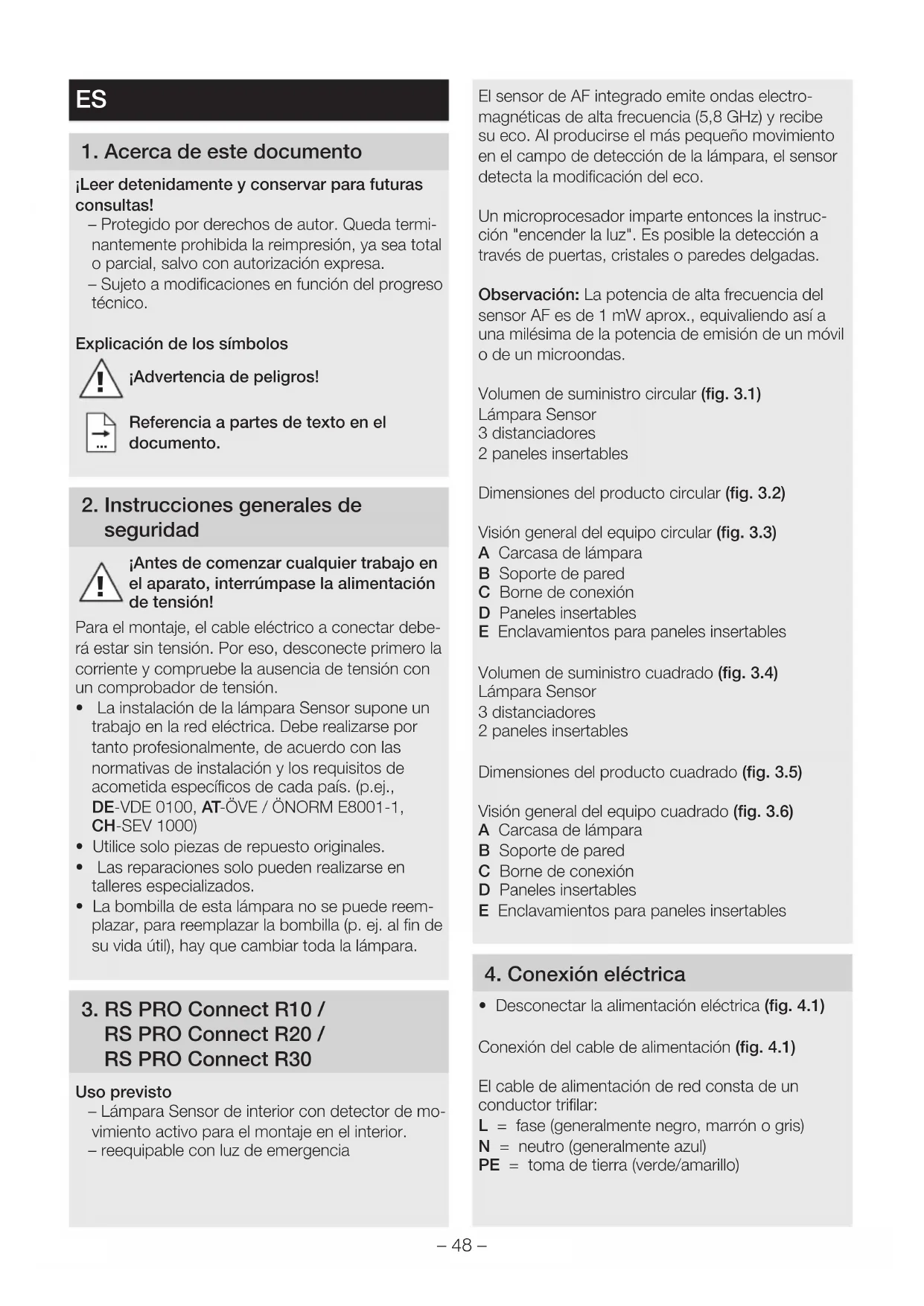 RS PRO Connect R20 / RS PRO Connect R30 Uso previsto – Lámpara Sensor de interior con detector de mo- vimiento activo para el montaje en el interior. – reequipable con luz de emergencia El sensor de AF integrado emite ondas electro- magnéticas de alta frecuencia (5,8GHz) y recibe su eco. Al producirse el más pequeño movimiento en el campo de detección de la lámpara, el sensor detecta la modificación del eco. Un microprocesador imparte entonces la instruc- ción "encender la luz". Es posible la detección a través de puertas, cristales o paredes delgadas. Observación: La potencia de alta frecuencia del sensor AF es de 1mW aprox., equivaliendo así a una milésima de la potencia de emisión de un móvil o de un microondas. Volumen de suministro circular (fig.3.1) Lámpara Sensor 3 distanciadores 2 paneles insertables Dimensiones del producto circular (fig.3.2) Visión general del equipo circular (fig.3.3) A Carcasa de lámpara B Soporte de pared C Borne de conexión D Paneles insertables E Enclavamientos para paneles insertables Volumen de suministro cuadrado (fig.3.4) Lámpara Sensor 3 distanciadores 2 paneles insertables Dimensiones del producto cuadrado (fig.3.5) Visión general del equipo cuadrado (fig.3.6) A Carcasa de lámpara B Soporte de pared C Borne de conexión D Paneles insertables E Enclavamientos para paneles insertables