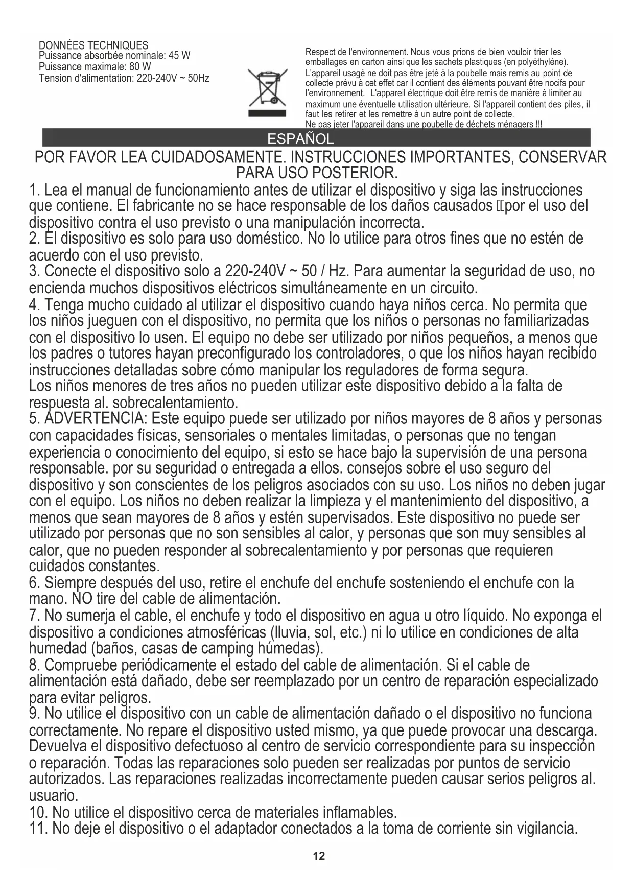 Entrada de energía nominal: 45 W Potencia máxima: 80 W Voltaje de suministro: 220-240V ~ 50Hz Preocupación por el medio ambiente. Por favor, lleva las cajas de cartón a un sitio de reciclaje. Las bolsas de polietileno se deben tirar al cubo de la basura amarillo (para envases). El equipo gastado debe ser entregado en el punto de almacenamiento adecuado, porque las piezas que constituyen el equipo pueden suponer un peligro para el medio ambiente. Debes entregar el equipo Hay que devolver el equipo eléctrico con el fin de evitar su reutilización. Si en el equipo se encuentran pilas, hay que sacarlas y entregar por separado, en un punto de almacenamiento adecuado. No tires el equipo al contenedor para residuos urbanos!! PORTUGUÊS POR FAVOR, LEIA ATENTAMENTE. INSTRUÇÕES IMPORTANTES, GUARDE PARA USO POSTERIOR.