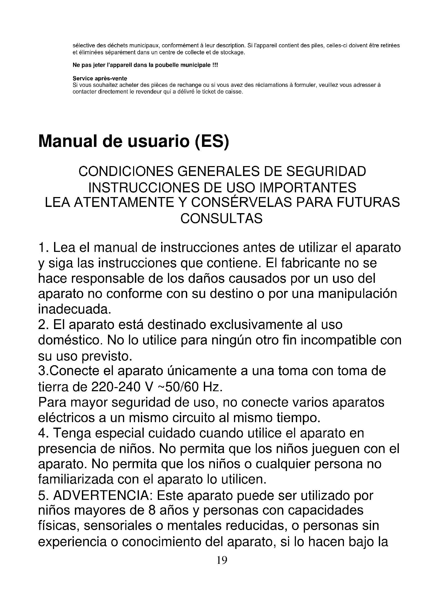 y siga las instrucciones que contiene. El fabricante no se hace responsable de los daños causados por un uso del aparato no conforme con su destino o por una manipulación inadecuada.