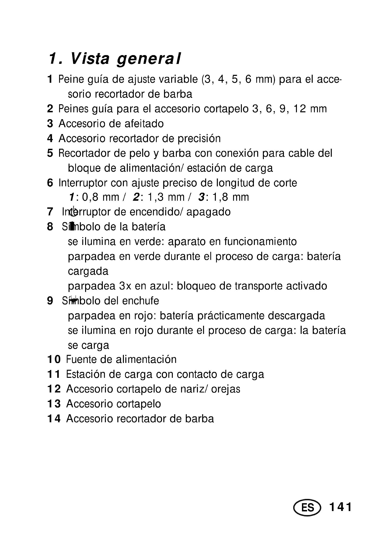 1 Peine guía de ajuste variable (3, 4, 5, 6 mm) para el acce- sorio recortador de barba 2 Peines guía para el accesorio cortapelo 3, 6, 9, 12 mm 3 Accesorio de afeitado 4 Accesorio recortador de precisión 5 Recortador de pelo y barba con conexión para cable del bloque de alimentación/estación de carga 6 Interruptor con ajuste preciso de longitud de corte 1: 0,8 mm / 2: 1,3 mm / 3:1,8mm 7 Interruptor de encendido/apagado 8 Símbolo de la batería se ilumina en verde: aparato en funcionamiento parpadea en verde durante el proceso de carga: batería cargada parpadea 3x en azul: bloqueo de transporte activado 9 Símbolo del enchufe parpadea en rojo: batería prácticamente descargada se ilumina en rojo durante el proceso de carga: la batería se carga 10 Fuente de alimentación 11 Estación de carga con contacto de carga 12 Accesorio cortapelo de nariz/orejas 13 Accesorio cortapelo 14 Accesorio recortador de barba142