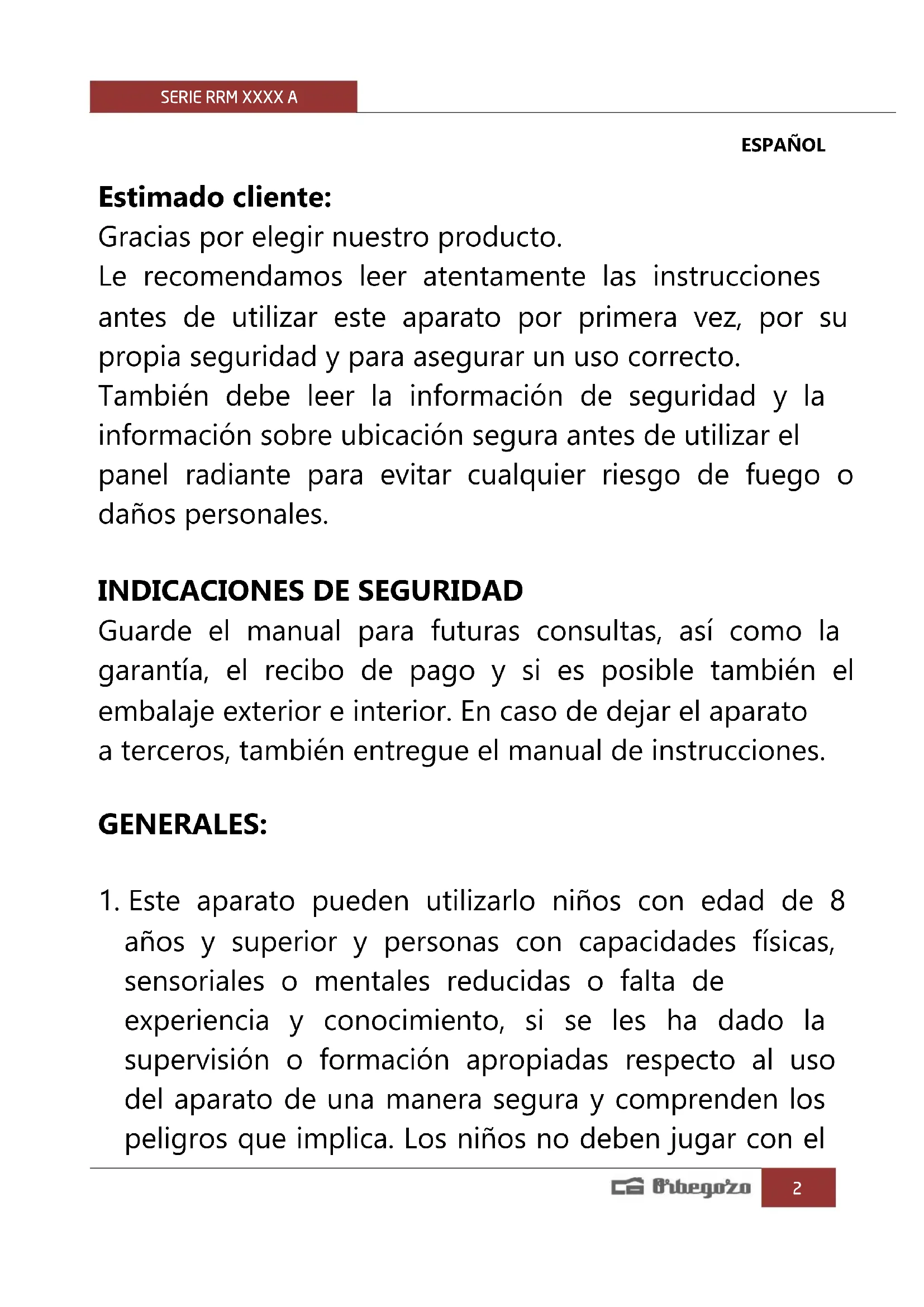 riesgo de posibles heridas. ESPECÍFICAS: El significado del símbolo es “NO CUBRIR”. ADVERTENCIA: En orden de evitar un sobrecalentamiento, no cubrir el aparato de calefacción. Los niños menores de 3 años deben mantenerse fuera del alcance del aparato a menos que sean continuamente supervisados. Los niños desde 3 años y menores de 8 años deben sólo encender/apagar el aparato siempre que éste haya sido colocado o instalado en su posición de funcionamiento normal prevista y que sean supervisados o hayan recibido instrucciones relativas al uso del aparato de una forma segura y entiendan los riesgos que el aparato tiene. Los niños desde 3 años y menores de 8 años no deben enchufar, regularSERIE RRM XXXX A