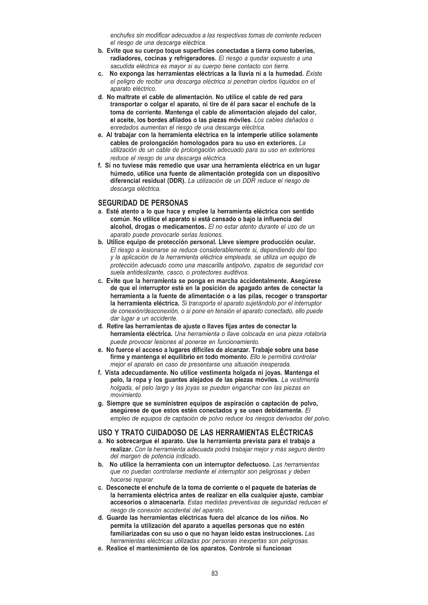 a. El enchufe de la herramienta eléctrica debe corresponder a la toma de corriente utilizada. No es admisible modicar el enchufe en forma alguna. No emplee adaptadores en aparatos dotados con una toma de tierra. Los83 enchufes sin modicar adecuados a las respectivas tomas de corriente reducen el riesgo de una descarga eléctrica. b. Evite que su cuerpo toque supercies conectadas a tierra como tuberías, radiadores, cocinas y refrigeradores. El riesgo a quedar expuesto a una sacudida eléctrica es mayor si su cuerpo tiene contacto con tierra. c. No exponga las herramientas eléctricas a la lluvia ni a la humedad. Existe el peligro de recibir una descarga eléctrica si penetran ciertos líquidos en el aparato eléctrico. d. No maltrate el cable de alimentación. No utilice el cable de red para transportar o colgar el aparato, ni tire de él para sacar el enchufe de la toma de corriente. Mantenga el cable de alimentación alejado del calor, el aceite, los bordes alados o las piezas móviles. Los cables dañados o enredados aumentan el riesgo de una descarga eléctrica. e. Al trabajar con la herramienta eléctrica en la intemperie utilice solamente cables de prolongación homologados para su uso en exteriores. La utilización de un cable de prolongación adecuado para su uso en exteriores reduce el riesgo de una descarga eléctrica. f. Si no tuviese más remedio que usar una herramienta eléctrica en un lugar húmedo, utilice una fuente de alimentación protegida con un dispositivo diferencial residual (DDR). La utilización de un DDR reduce el riesgo de descarga eléctrica.