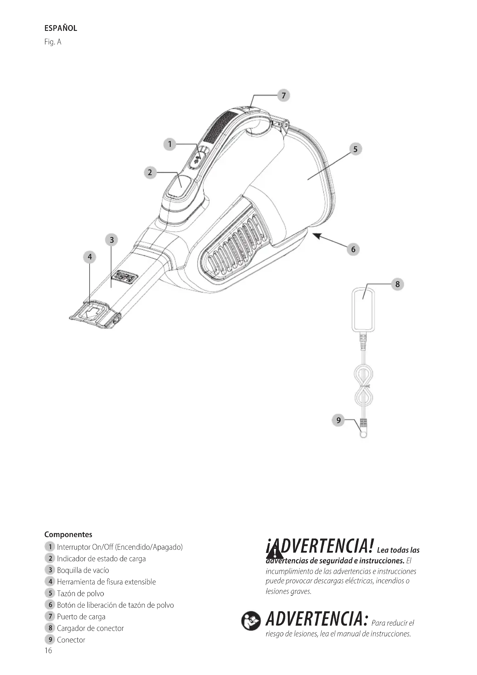 ADVERTENCIA: No intente modificar o reparar el aparato. Uso pretendido Su aspiradora inalámbrica de ion de litio BLACK+DECKER se diseñó para propósitos de aspirado en seco ligero. Este aparato está diseñado para uso doméstico únicamente. Carga de la batería (Fig. B)