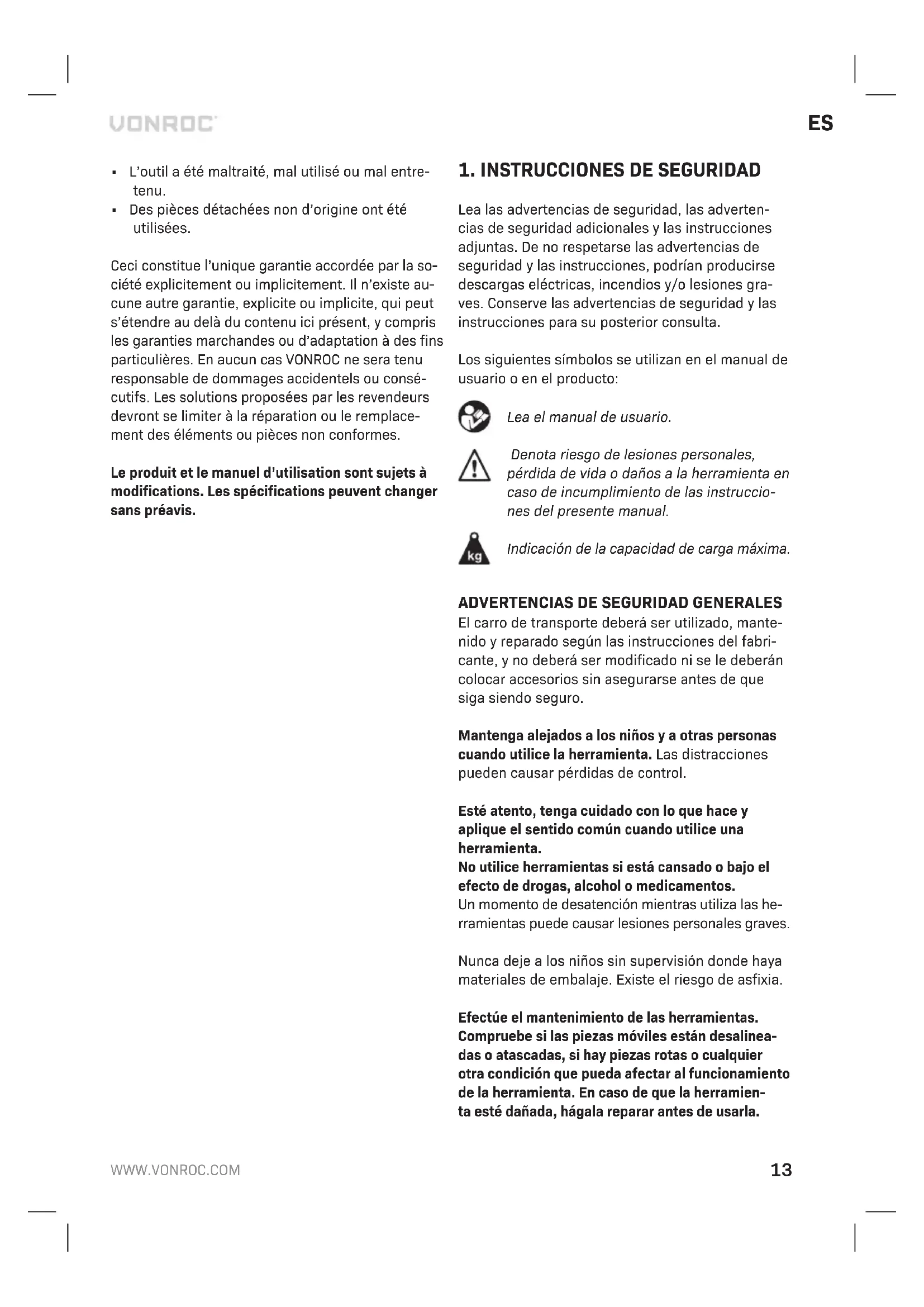 - Si se han utilizado piezas de repuesto no origi- nales. La presente constituye la única garantía implícita y explícita que ofrece la compañía. No existen otras garantías explícitas o implícitas que excedan las citadas aquí, incluidas las garantías implícitas de comerciabilidad e idoneidad para una finalidad en especial. VONROC no será considerada respon- sable en ningún caso por daños incidentales o consecuentes. Los recursos a disposición de los distribuidores se limitan a la reparación o a la sus- titución de las unidades o piezas no conformes. El producto y el manual de usuario están sujetos a variaciones. Las especificaciones pueden variarse sin previo aviso.16