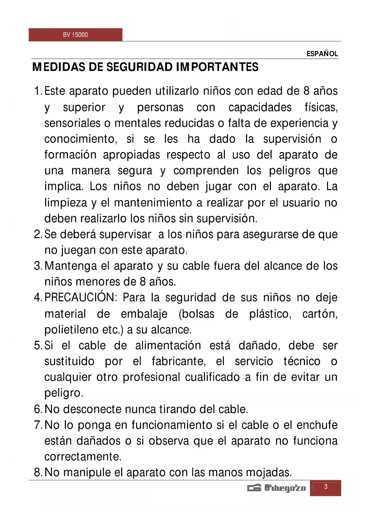 MANUAL DE USUARIO BV 15000 Orbegozo