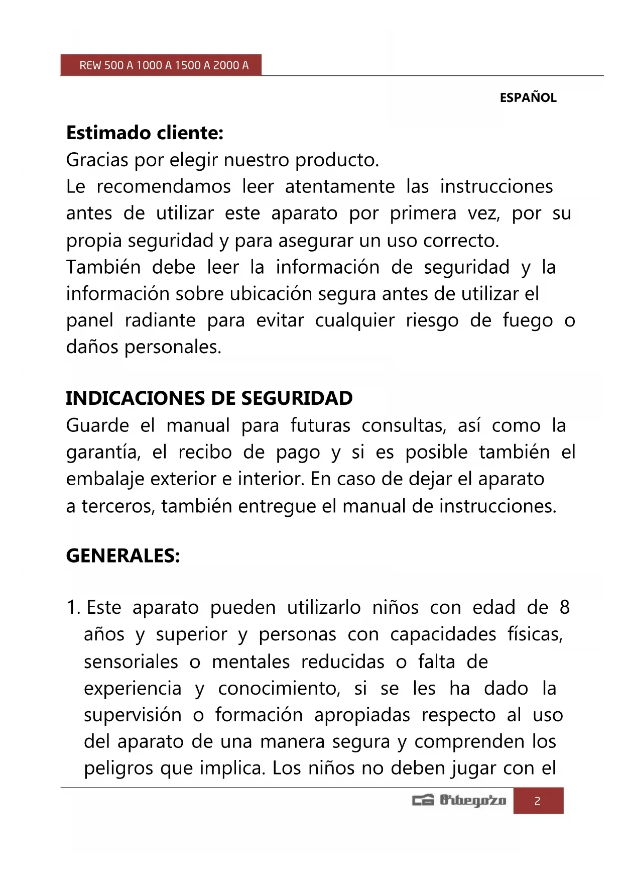 y limpiar el aparato o realizar operaciones de mantenimiento. PRECAUCIÓN: Algunas partes de este aparato pueden ponerse muy calientes y causar quemaduras. Debe ponerse atención particular cuando los niños y las personas vulnerables estén presentes. El aparato no debe colocarse inmediatamente debajo de una base de toma de corriente. No situar el aparato próximo a paredes, mobiliario, entelados, cortinas, ropas de cama y otros materiales inflamables ya que hay riesgo de incendio. No usar este aparato de calefacción en el entorno inmediato de una bañera, ducha o piscina. No usar este aparato de calefacción con un programador, temporizador u otro dispositivo que conecte el aparato de calefacción automáticamente, ya que existe riesgo de incendio si el aparato de calefacción está cubierto o colocado incorrectamente. Antes de conectar el dispositivo compruebe que la tensión indicada en la placa de características coincide con la tensión de la corriente de su hogar. Conecte el aparato únicamente a un suministro de AC que coincida con el especificado en la placa de características.REW 500 A 1000 A 1500 A 2000 A