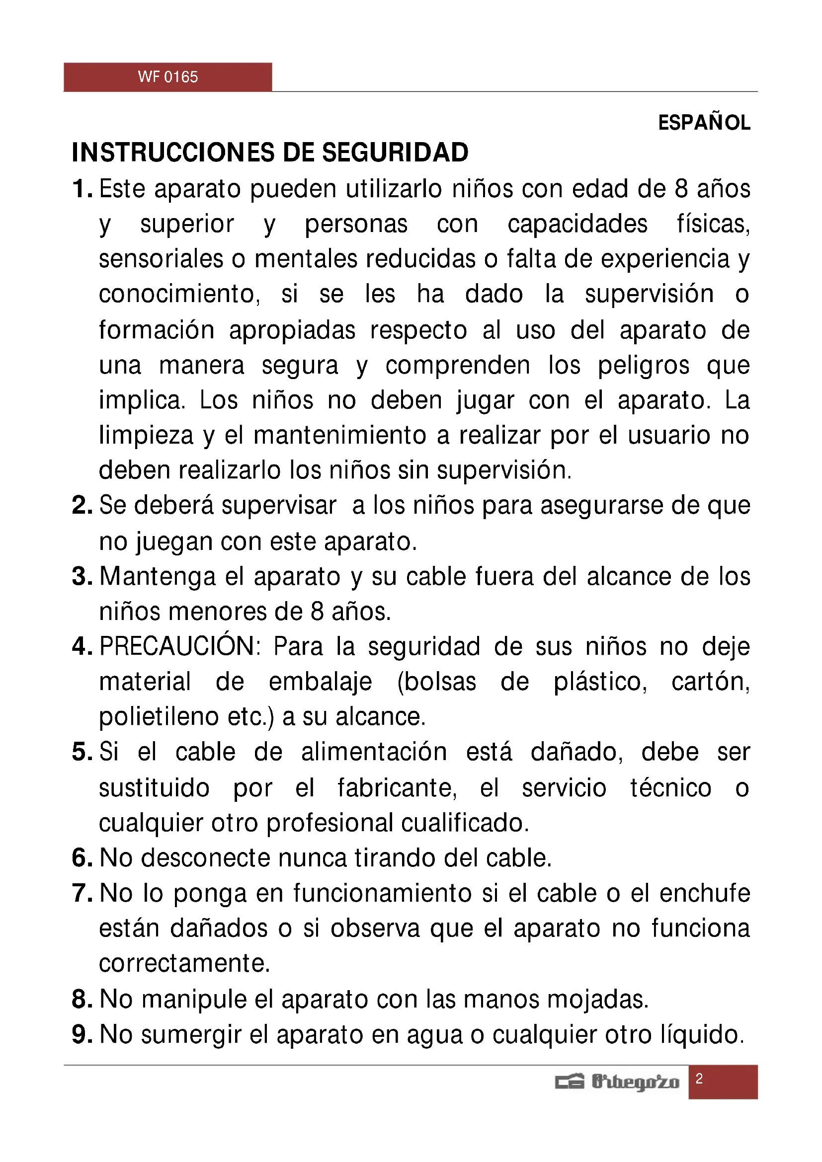 MANUAL DE USUARIO WF 0165 Orbegozo