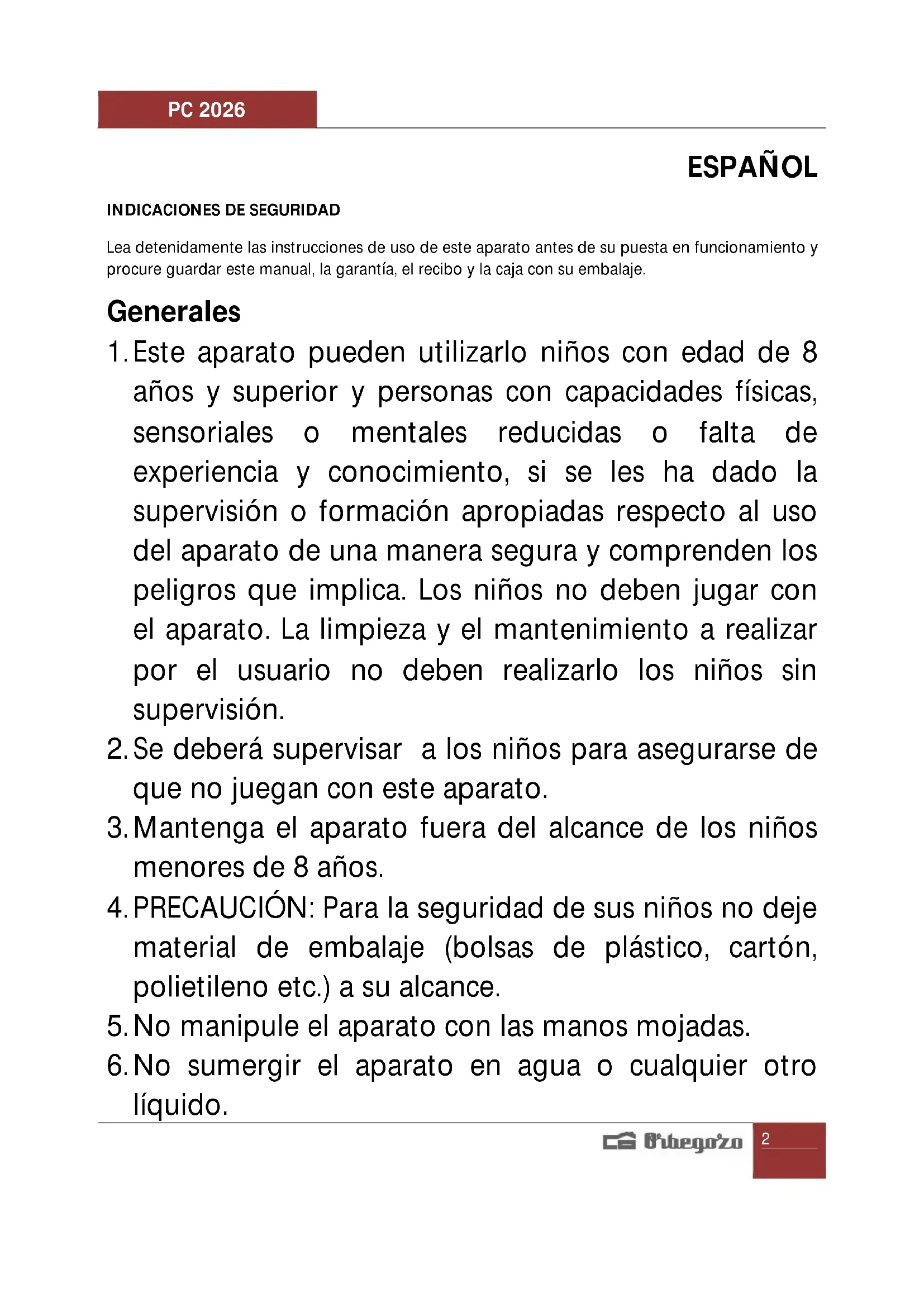 Encuentra gratis el manual del aparato PC 2026 Orbegozo en formato PDF.