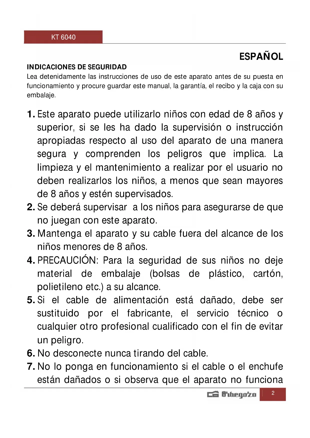 Encuentra gratis el manual del aparato KT 6040 Orbegozo en formato PDF.