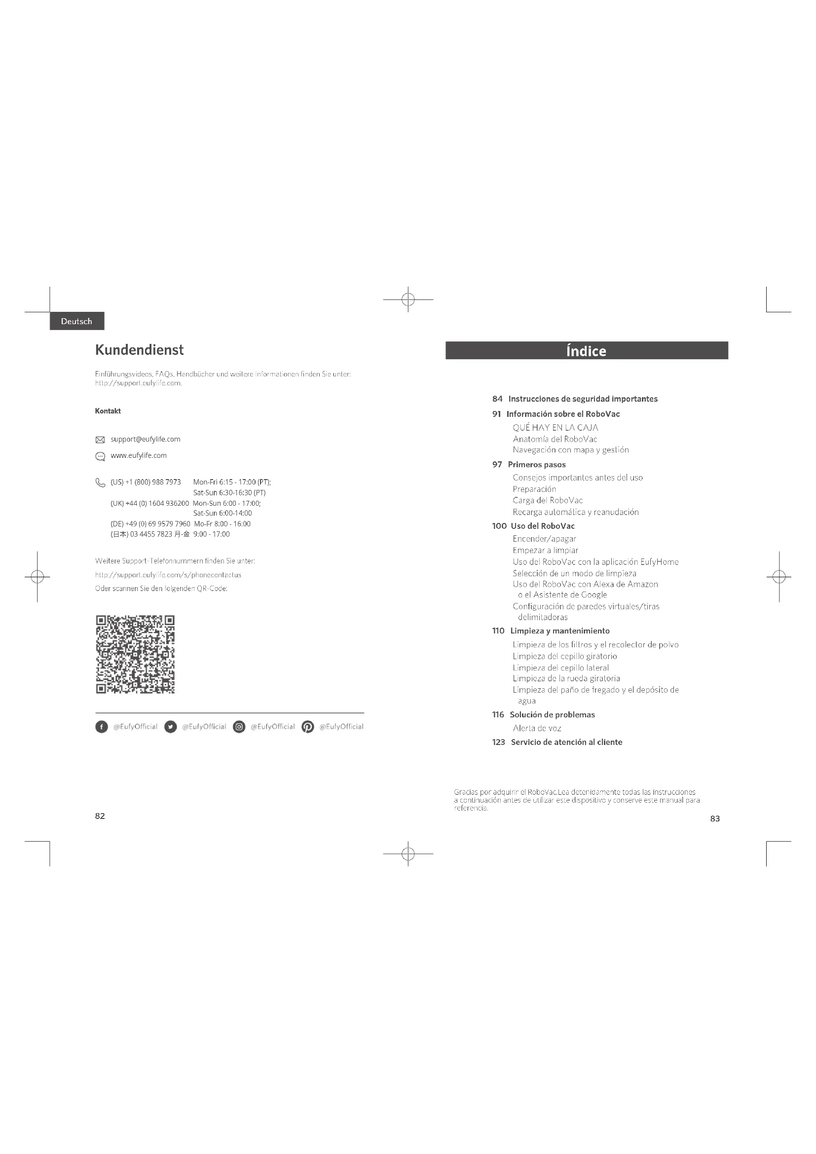 - Otros dispositivos que generen reflejos Retire cualquier obstáculo y mueva el dispositivo a una zona distinta. Error 21: La base de carga está bloqueada por obstáculos cercanos. La base de carga está bloqueada por obstáculos. Retire cualquier obstáculo cercano a la base de carga e inténtelo de nuevo. Error S1: Error de la batería. Consulte el Manual del propietario o la aplicación para obtener ayuda. - Abra el compartimento de la batería y compruebe si la batería está conectada y reinicie el dispositivo. - La temperatura de la batería puede ser demasiado alta o baja; espere hasta que baje a temperaturas normales antes de usarla (de 0 °C a 40 °C) - Si el problema persiste, comuníquese con el servicio de atención al cliente para obtener ayuda. Mensaje de voz Causa y solución Error 1: Paragolpes frontal atascado. Si el parachoques delantero está atascado, empuje suavemente el parachoques hacia adentro repetidamente para desalojar cualquier objeto atrapado en su interior.Si no hay nada allí, intente mover el dispositivo a una nueva zona y reinicie. Error 2: Rueda atascada. Compruebe la rueda y muévala a una nueva posición. Puede que la rueda esté atascada o atrapada.Retire cualquier obstáculo cercano y compruebe que no haya polvo atrapado en la rueda.Mueva el dispositivo a una nueva ubicación e inténtelo de nuevo. Error 3: Cepillo lateral atascado. Puede que el cepillo lateral esté atascado.Límpielo e inténtelo de nuevo. Error 4: Cepillo giratorio atascado.Retire el cepillo giratorio y límpielo. Retire el cepillo giratorio, la junta del cepillo, la tapa del cepillo giratorio y la entrada de aspiración para limpiarlo.Una vez limpio, coloque de nuevo las piezas en el dispositivo e inténtelo de nuevo. Error 5: El dispositivo está atrapado.Limpie la zona cercana. El dispositivo está atrapado.Retire cualquier obstáculo cercano e inténtelo de nuevo. Error 6: El dispositivo está atrapado.Vuelva a colocar el dispositivo cerca del área donde ocurrió el problema Puede que el dispositivo esté suspendido en el aire. Muévalo a una nueva ubicación cercana a la ubicación original e inténtelo de nuevo.Si el dispositivo aún no se inicia, limpie el sensor de bordes e inténtelo de nuevo. Error 7: Rueda suspendida. Mueva el dispositivo a una nueva ubicación. Puede que las ruedas estén suspendidas en el aire. Mueva el dispositivo a una superficie plana y a una nueva ubicación cercana a la ubicación original e inténtelo de nuevo. Error 8: Batería baja, el dispositivo se está apagando.Cargue el dispositivo. El nivel de batería es bajo y el dispositivo se apagará. Cargue el dispositivo e inténtelo de nuevo. Error 9: Se ha detectado una tira delimitadora magnética.Mueva el dispositivo a una zona distinta. El dispositivo está demasiado cerca de un campo magnético fuerte o de una tira.Mueva el dispositivo a una zona distinta e inténtelo de nuevo. Error 12: El sensor de pared derecho requiere limpieza. Limpie el sensor de pared derecho, ya que está cubierto de polvo.122 123 Español Español Servicio de atención al cliente Para ver vídeos tutoriales, preguntas frecuentes, manuales y más información, visite: http://support.eufylife.com. Contacte con nosotros support@eufylife.com (US) +1 (800) 988 7973 Mon-Fri 6:15 - 17:00 (PT); Sat-Sun 6:30-16:30 (PT) (UK) +44 (0) 1604 936200 Mon-Sun 6:00 - 17:00; Sat-Sun 6:00-14:00 (DE) +49 (0) 69 9579 7960 Mo-Fr 8:00 - 16:00 (日本) 03 4455 7823 月-金 9:00 - 17:00 www.eufylife.com Para obtener más números de teléfono de asistencia, visite: http://support.eufylife.com/s/phonecontactus O escanee el código QR siguiente: Mensaje de voz Causa y solución Error S2: Error del módulo de la rueda.Consulte el Manual del propietario o la aplicación para obtener ayuda. - Compruebe si las ruedas están atascadas o si hay polvo atrapado en el interior antes de reiniciar el dispositivo. - Si el problema persiste, comuníquese con el servicio de atención al cliente para obtener ayuda. Error S4: Error del ventilador de aspiración. Consulte el Manual del propietario o la aplicación para obtener ayuda. - Compruebe si las aspas del ventilador están atascadas en un objeto desconocido antes de reiniciar el dispositivo. - Limpie el depósito de polvo y el filtro antes de reiniciar el dispositivo. - Si el problema persiste, comuníquese con el servicio de atención al cliente para obtener ayuda. Error S5: Error del cepillo giratorio.Consulte el Manual del propietario o la aplicación para obtener ayuda. - Retire y limpie el cepillo giratorio, la conexión del cepillo giratorio, la tapa del cepillo giratorio y la entrada de succión antes de reiniciar el dispositivo. - Si el problema persiste, comuníquese con el servicio de atención al cliente para obtener ayuda.