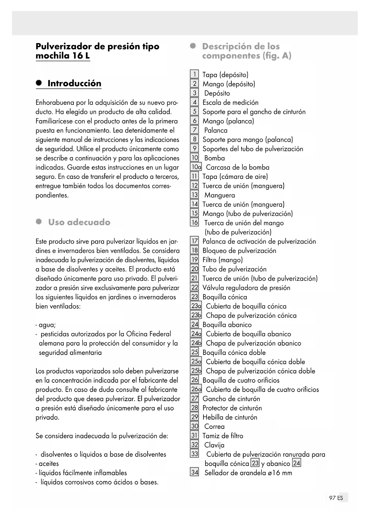 - Asegúrese de que los usuarios no experimenta- dos reciben la formación suficiente antes de la utilización. Aclaración de los símbolos: Pulverizador a presión de 16 l Presión de funcionamiento permitida: máx. aprox. 2‒4 bar ¡No utilice sustancias corrosivas! No pulverice a aparatos eléctricos, cables eléctricos y conducciones. ¡No pulverice a personas! ¡No pulverice a animales! ¡Pulverice solo a plantas! ¡No utilice el producto para beber! No deje el pulverizador presurizado bajo el sol. ¡Existe peligro de explosión! Manténgalo alejado de llamas abiertas o fuentes de calor. ¡Cierre correctamente los recipientes y guárdelos en un lugar seguro contra incendios! ¡No utilice líquidos fácilmente inflamables!101 ES Proteger y guardar protegido contra heladas. Almacenamiento a 0 °C–40 °C en lugares secos y libres de polvo. ¡Utilice protección ocular! ¡Utilice protección respiratoria! ¡Utilice ropa protectora adecuada! ¡Utilice botas de goma impermeables! ¡Utilice guantes impermeables! Lea atentamente el manual antes de utilizar el producto por primera vez. Válvula reguladora de presión Con la ayuda de la válvula reguladora de pre- sión