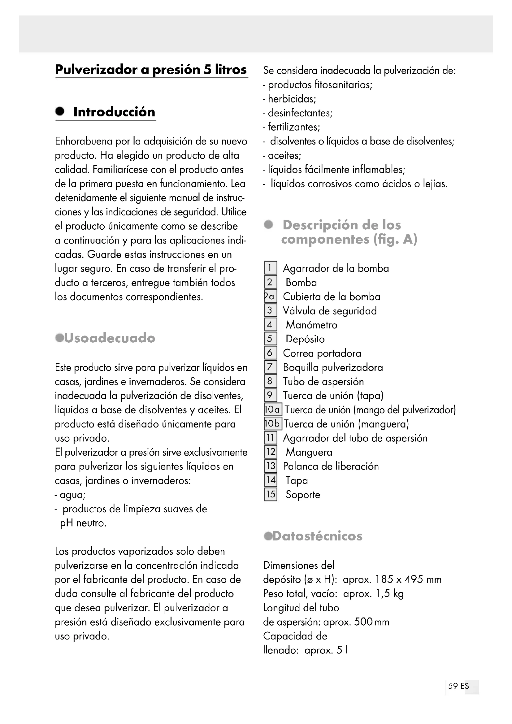 Soporte Datos técnicos Dimensiones del depósito (ø x H): aprox. 185 x 495 mm Peso total, vacío: aprox. 1,5 kg Longitud del tubo de aspersión: aprox. 500 mm Capacidad de llenado: aprox. 5 l60 ES Máx. presión de funcionamiento permitida: aprox. 2,5 bar Temperatura de empleo: 0–40 °C Modo de transporte: lateral con correa portadora Volumen de suministro 1 pulverizador a presión 1 tubo de aspersión 1 correa portadora 1 manguera 1 boquilla pulverizadora 1 manual de instrucciones Indicaciones de seguridad Advertencias generales de seguridad