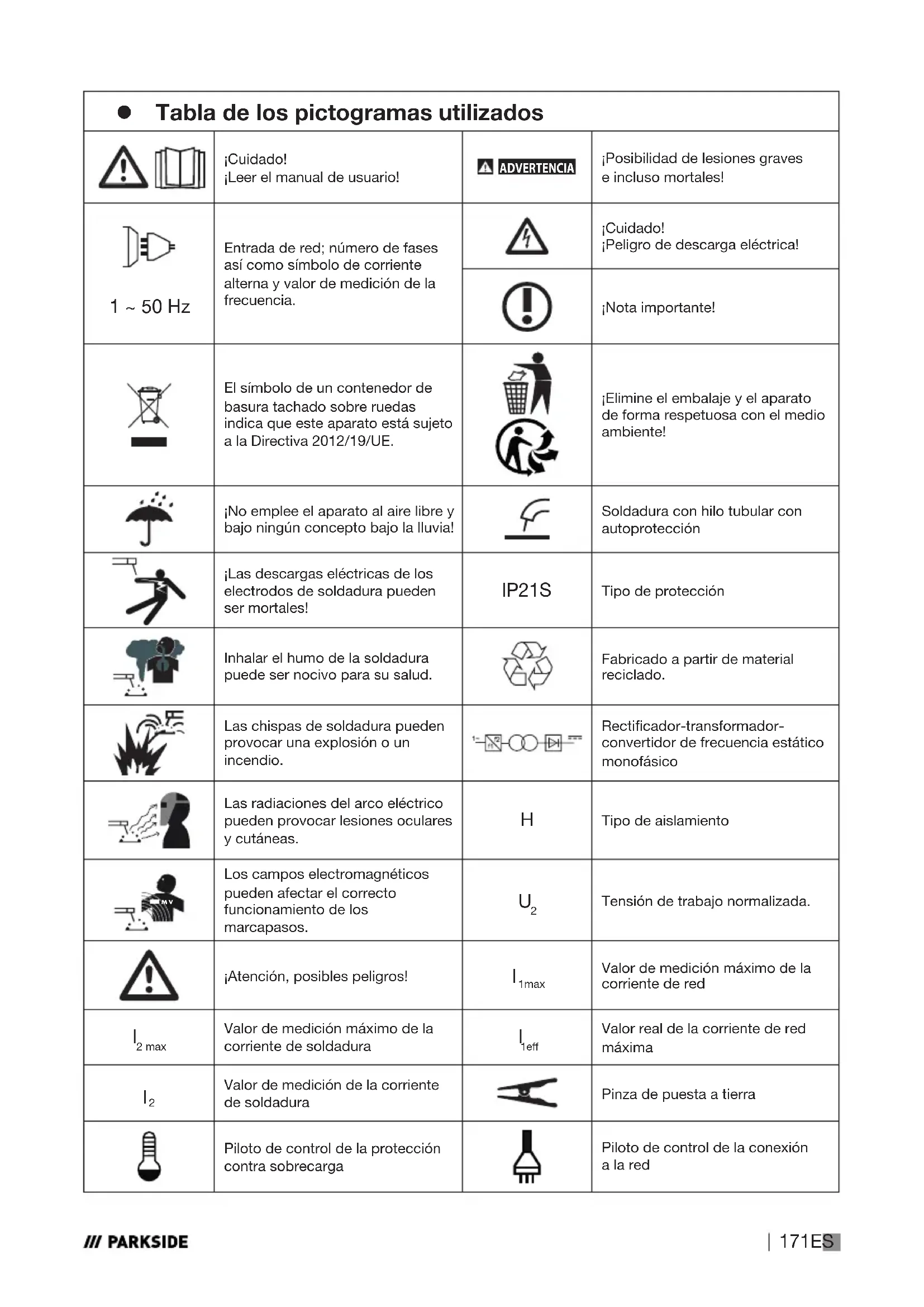 Názov: C. M. C. GmbH Holding Internetová adresa: www.cmc-creative.de E-mail: service.sk@cmc-creative.de Telefón: 0850 232001 Sídlo: Nemecko IAN 472024_2407 Upozorňujeme, že nasledujúca adresa nie je adresou servisu. Najprv sa obráťte na uvedené servisné miesto. Adresa: C. M. C. GmbH Holding, Katharina-Loth-Str. 15, DE-66386 St. Ingbert, NEMECKO Objednávky náhradných dielov: www.ersatzteile.cmc-creative.de 472024_2407_Inverter-Fülldrahtschweißgerät_LB8_content.indb 169472024_2407_Inverter-Fülldrahtschweißgerät_LB8_content.indb 169 18.10.2024 10:06:2718.10.2024 10:06:27170 ES Tabla de los pictogramas utilizados ..............................................Página 171 Introducción .....................................................................................Página 172 Uso previsto..................................................................................................................Página 172 Volumen de suministro .................................................................................................Página 172 Descripción de las piezas .............................................................................................Página 173 Características técnicas ...............................................................................................Página 174 Indicaciones de seguridad .............................................................Página 174 Fuentes de peligro durante la soldadura con arco eléctrico ........................................Página 176 Indicaciones de seguridad especícas de la pantalla de soldadura ............................Página 179 Entorno con peligro eléctrico elevado ..........................................................................Página 180 Soldadura en espacios reducidos ................................................................................Página 181 Acumulación de las tensiones en vacío .......................................................................Página 181 Uso de cabestrillo .........................................................................................................Página 181 Ropa de protección ......................................................................................................Página 182 Protección contra radiaciones y quemaduras ..............................................................Página 182 Clasicación CEM del aparato .....................................................................................Página 183 Antes de la puesta en funcionamiento ..........................................Página 184 Montaje .............................................................................................Página 184 Montaje de la pantalla de soldadura ............................................................................Página 184 Colocación del hilo tubular ...........................................................................................Página 184 Puesta en funcionamiento ..............................................................Página 186 Conexión y desconexión del aparato ...........................................................................Página 186 Ajuste de la corriente de soldadura y el avance de alambre ........................................Página 186 Soldadura .....................................................................................................................Página 187 Generación de un cordón de soldadura .......................................................................Página 188 Mantenimiento .................................................................................Página 190 Indicaciones medioambientales y de desecho de residuos .......Página 190 Declaración de conformidad UE .................................................... Página 191 Información sobre la garantía yel servicio posventa .................. Página 192 Condiciones de la garantía ...........................................................................................Página 192 Periodo de garantía y reclamaciones por defectos estipuladas por ley.......................Página 192 Cobertura de la garantía ...............................................................................................Página 192 Proceso en caso de garantía ........................................................................................Página 193 Servicio ............................................................................................. Página 193 472024_2407_Inverter-Fülldrahtschweißgerät_LB8_content.indb 170472024_2407_Inverter-Fülldrahtschweißgerät_LB8_content.indb 170 18.10.2024 10:06:2818.10.2024 10:06:28171ES z Tabla de los pictogramas utilizados ¡Cuidado! ¡Leer el manual de usuario! ADVERTENCIA ¡Posibilidad de lesiones graves eincluso mortales! Entrada de red; número de fases así como símbolo de corriente alterna y valor de medición de la frecuencia. ¡Cuidado! ¡Peligro de descarga eléctrica! 1 ~ 50 Hz ¡Nota importante! El símbolo de un contenedor de basura tachado sobre ruedas indica que este aparato está sujeto a la Directiva 2012/19/UE. ¡Elimine el embalaje y el aparato de forma respetuosa con el medio ambiente! ¡No emplee el aparato al aire libre y bajo ningún concepto bajo la lluvia! Soldadura con hilo tubular con autoprotección ¡Las descargas eléctricas de los electrodos de soldadura pueden ser mortales! IP21S Tipo de protección Inhalar el humo de la soldadura puede ser nocivo para su salud. Fabricado a partir de material reciclado. Las chispas de soldadura pueden provocar una explosión o un incendio. Recticador-transformador- convertidor de frecuencia estático monofásico Las radiaciones del arco eléctrico pueden provocar lesiones oculares y cutáneas.