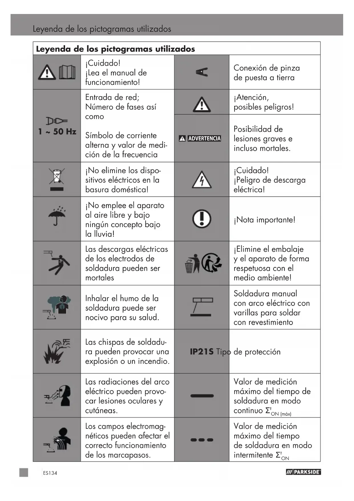ONES 135 Leyenda de los pictogramas utilizados / Introducción Soldador eléctrico PESG 120 B4 z Introducción ¡Enhorabuena! Usted ha elegido un dispositivo de calidad de nuestra empresa. Familiarí- cese con el producto antes de la primera puesta en funcionamiento. Para ello, lea detenidamente las siguientes instrucciones de manejo y las indicacio- nes de seguridad. La puesta en marcha de esta herramienta debe ser realizada por personal capacitado.