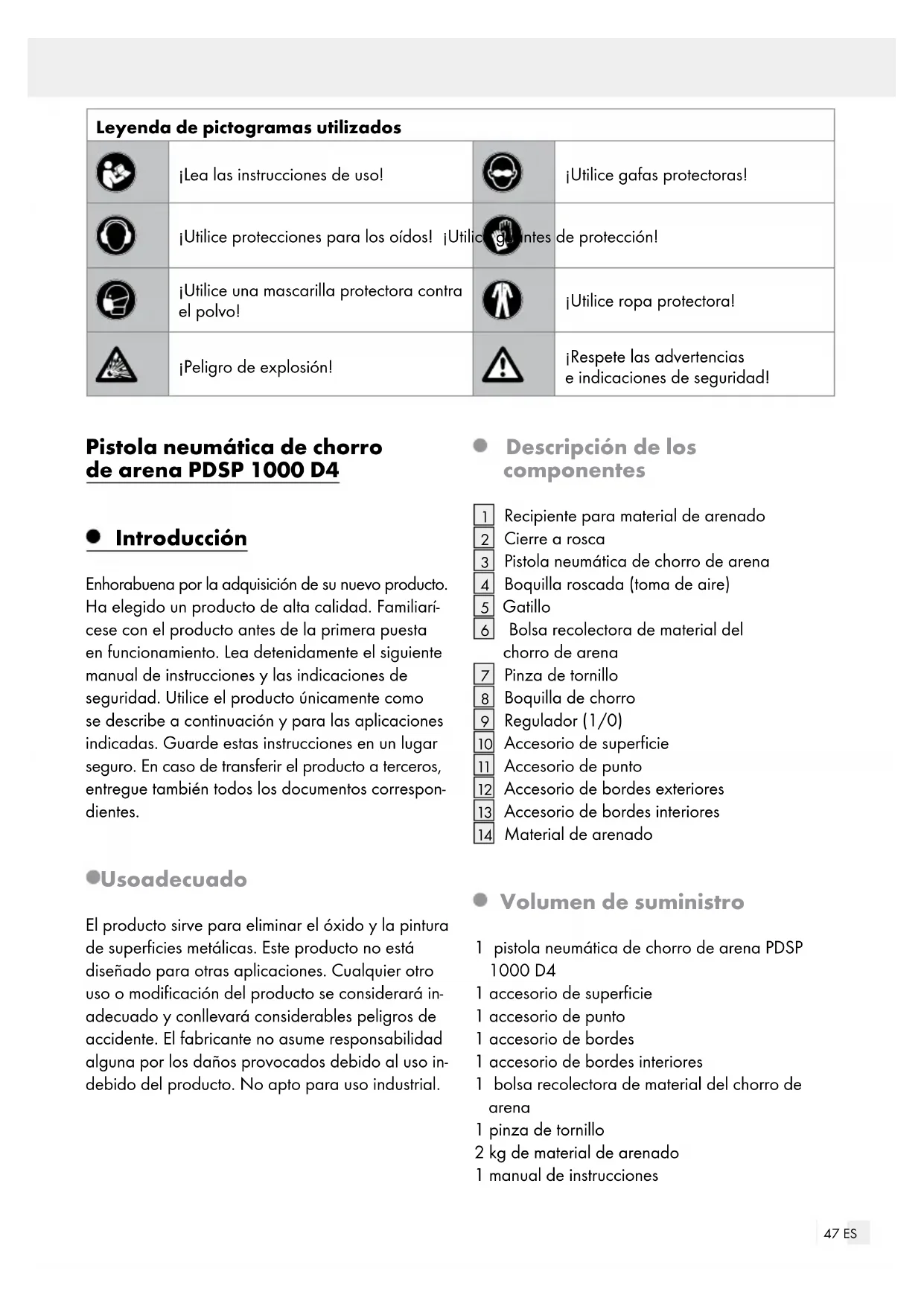 Material de arenado Volumen de suministro 1 pistola neumática de chorro de arena PDSP 1000 D4 1 accesorio de superficie 1 accesorio de punto 1 accesorio de bordes 1 accesorio de bordes interiores 1 bolsa recolectora de material del chorro de arena 1 pinza de tornillo 2 kg de material de arenado 1 manual de instrucciones48 ES Características técnicas Presión de trabajo: 6,3 bar Consumo de aire: 320 l / min Contenido del recipiente: 0,9 l Calidad necesaria del aire: limpio y sin aceites Parámetros de trabajo: presión de trabajo estable- cida en el reductor de presión o el manómetro de filtro máx. 6,3 bar. Emisiones acústicas: Valor de medida del ruido conforme a la normativa EN 1265. Los niveles ponderados de ruido de tipo A de la herramienta de aire comprimido ascienden normalmente a: Nivel de presión de sonido: L = 94 dB(A) Incertidumbre: K = 3 dB(A) Nivel de potencia de sonido: L = 105 dB(A) Incertidumbre: K = 3 dB(A) ¡Utilice protecciones para los oídos! Valor de emisión de oscilaciones: Valor total de vibraciones emitidas de acuerdo con EN ISO 20643: ah < 2,5 m / s