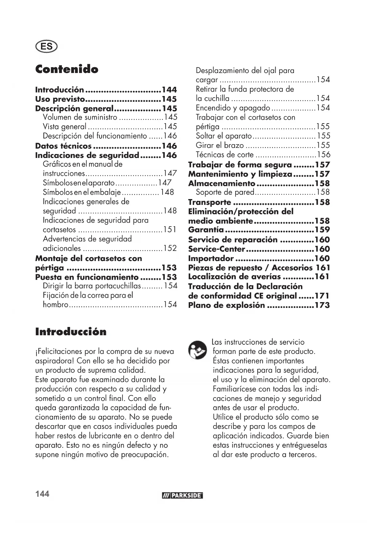 - Piezas de repuesto / Accesorios 161 Localización de averías Las instrucciones de servicio forman parte de este producto. Éstas contienen importantes indicaciones para la seguridad, el uso y la eliminación del aparato. Familiarícese con todas las indi- caciones de manejo y seguridad antes de usar el producto. Utilice el producto sólo como se describe y para los campos de aplicación indicados. Guarde bien estas instrucciones y entrégueselas al dar este producto a terceros.145 p. 161