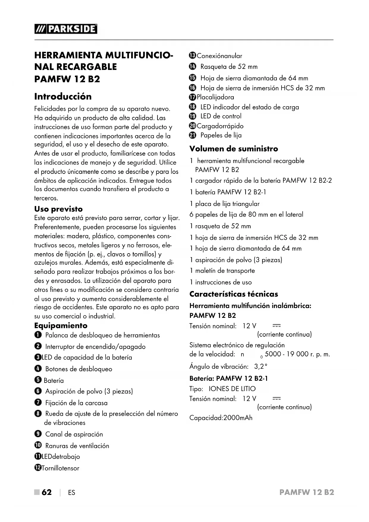 ES HERRAMIENTA MULTIFUNCIO- NAL RECARGABLE PAMFW 12 B2 Introducción Felicidades por la compra de su aparato nuevo. Ha adquirido un producto de alta calidad. Las instrucciones de uso forman parte del producto y contienen indicaciones importantes acerca de la seguridad, el uso y el desecho de este aparato. Antes de usar el producto, familiarícese con todas las indicaciones de manejo y de seguridad. Utilice el producto únicamente como se describe y para los ámbitos de aplicación indicados. Entregue todos los documentos cuando transfiera el producto a terceros. Uso previsto Este aparato está previsto para serrar, cortar y lijar. Preferentemente, pueden procesarse los siguientes materiales: madera, plástico, componentes cons- tructivos secos, metales ligeros y no ferrosos, ele- mentos de fijación (p. ej., clavos o tornillos) y azulejos murales. Además, está especialmente di- señado para realizar trabajos próximos a los bor- des y enrasados. La utilización del aparato para otros fines o su modificación se considera contraria al uso previsto y aumenta considerablemente el riesgo de accidentes. Este aparato no es apto para su uso comercial o industrial. Equipamiento Palanca de desbloqueo de herramientas Interruptor de encendido/apagado LED de capacidad de la batería Botones de desbloqueo Batería Aspiración de polvo (3 piezas) Fijación de la carcasa Rueda de ajuste de la preselección del número de vibraciones Canal de aspiración Ranuras de ventilación LED de trabajo Tornillo tensor Conexión anular Rasqueta de 52 mm Hoja de sierra diamantada de 64 mm Hoja de sierra de inmersión HCS de 32 mm Placa lijadora LED indicador del estado de carga LED de control Cargador rápido Papeles de lija Volumen de suministro 1 herramienta multifuncional recargable PAMFW 12 B2 1 cargador rápido de la batería PAMFW 12 B2-2 1 batería PAMFW 12 B2-1 1 placa de lija triangular 6 papeles de lija de 80 mm en el lateral 1 rasqueta de 52 mm 1 hoja de sierra de inmersión HCS de 32 mm 1 hoja de sierra diamantada de 64 mm 1 aspiración de polvo (3 piezas) 1 maletín de transporte 1 instrucciones de uso Características técnicas Herramienta multifunción inalámbrica: PAMFW 12 B2 Tensión nominal: 12 V (corriente continua) Sistema electrónico de regulación de la velocidad: n
