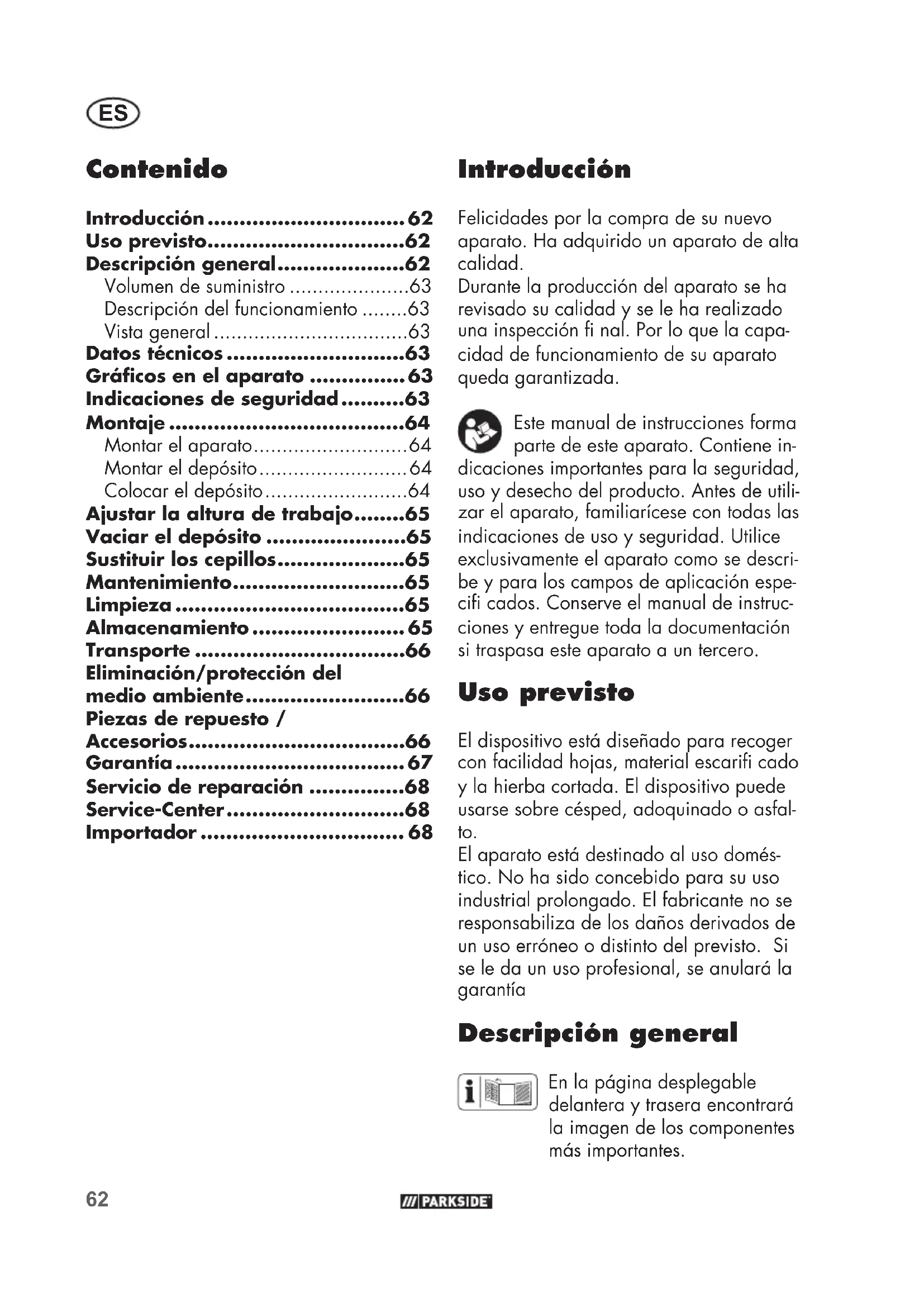 - Importador Introducción Felicidades por la compra de su nuevo aparato. Ha adquirido un aparato de alta calidad. Durante la producción del aparato se ha revisado su calidad y se le ha realizado una inspección fi nal. Por lo que la capa- cidad de funcionamiento de su aparato queda garantizada. Este manual de instrucciones forma parte de este aparato. Contiene in- dicaciones importantes para la seguridad, uso y desecho del producto. Antes de utili- zar el aparato, familiarícese con todas las indicaciones de uso y seguridad. Utilice exclusivamente el aparato como se descri- be y para los campos de aplicación espe- cifi cados. Conserve el manual de instruc- ciones y entregue toda la documentación si traspasa este aparato a un tercero. Uso previsto El dispositivo está diseñado para recoger con facilidad hojas, material escarifi cado y la hierba cortada. El dispositivo puede usarse sobre césped, adoquinado o asfal- to. El aparato está destinado al uso domés- tico. No ha sido concebido para su uso industrial prolongado. El fabricante no se responsabiliza de los daños derivados de un uso erróneo o distinto del previsto. Si se le da un uso profesional, se anulará la garantía Descripción general En la página desplegable delantera y trasera encontrará la imagen de los componentes más importantes.63 p. 68