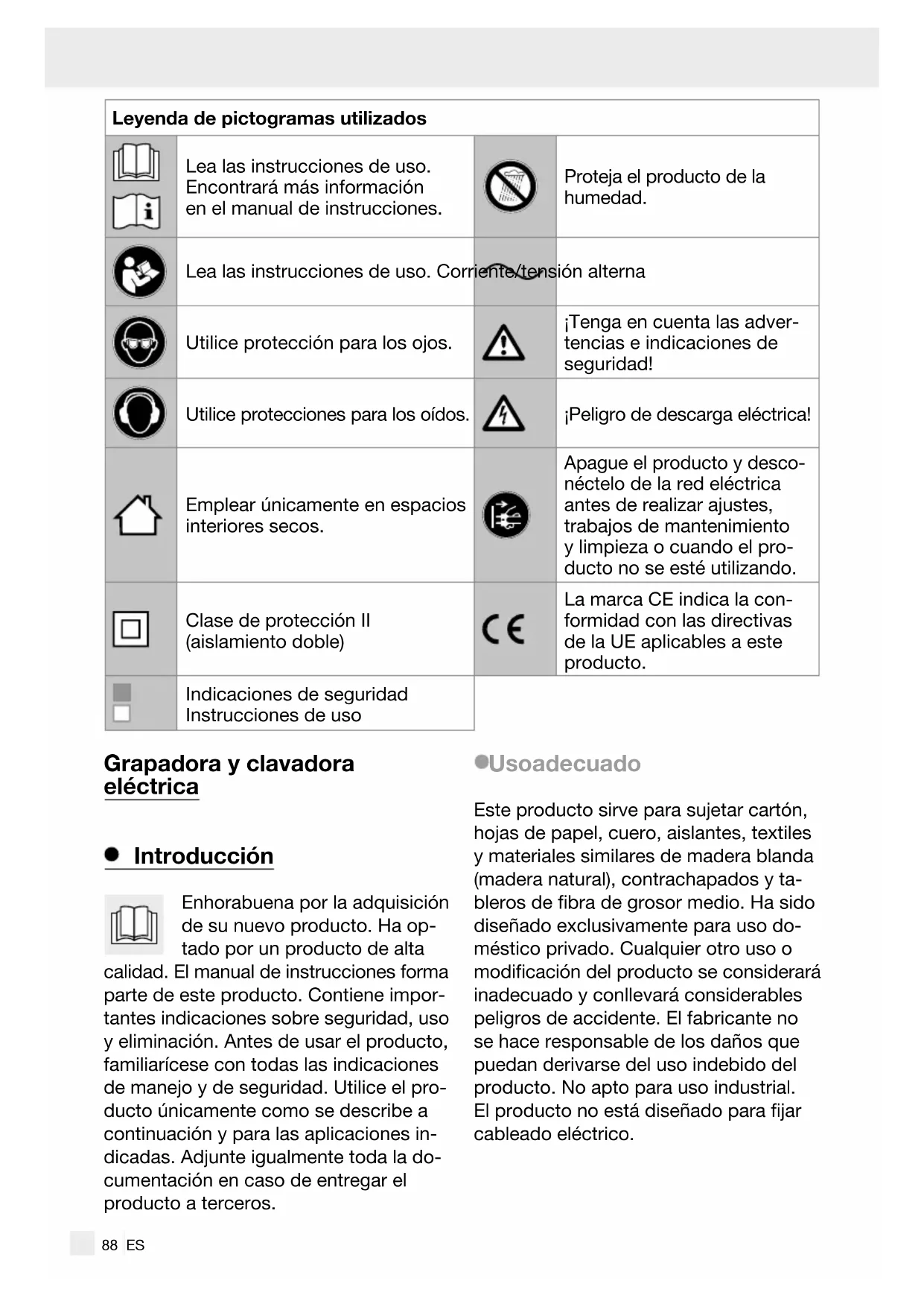 y desconecte el producto de la red eléctrica antes de empezar los trabajos con el producto. El producto no requiere manteni- miento. Compruebe cuidadosamente el pro- ducto antes y después de cada utili- zación en busca de signos de desgaste y daños. Reparación Este producto no contiene piezas que el usuario pueda reparar. Diríjase a un dis- tribuidor autorizado o a una persona con cualicaciones similares para reparar o revisar el producto. Almacenamiento Limpie el producto como se ha des- crito anteriormente. Antes del almacenaje, retire todas las grapas y todos los clavos del pozo del depósito