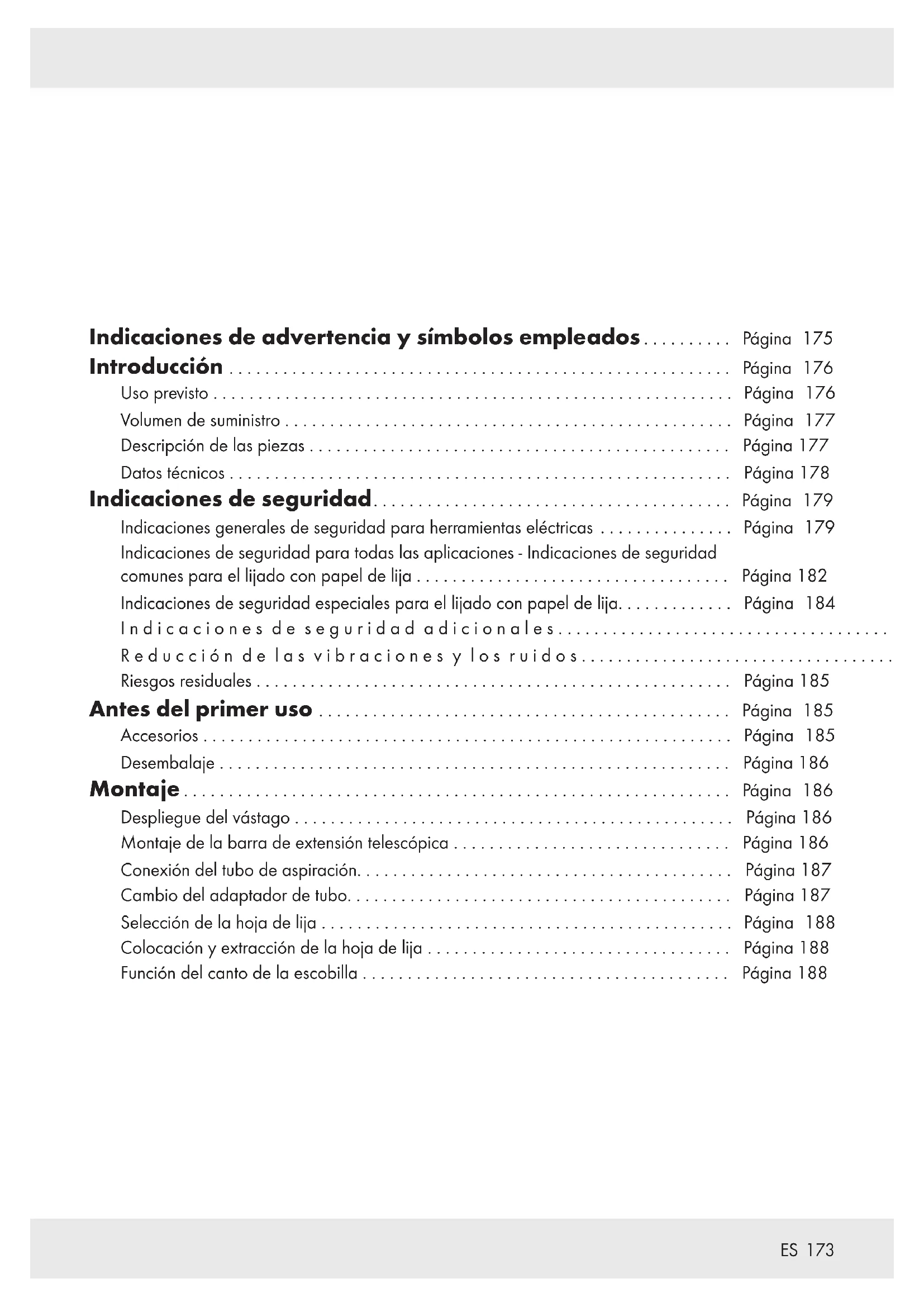 Indicaciones de advertencia y símbolos empleados .......... Página 175 Introducción ........................................................ Página 176 Uso previsto .......................................................... Página 176 Volumen de suministro .................................................. Página 177 Descripción de las piezas ............................................... Página 177 Datos técnicos ........................................................ Página 178 Indicaciones de seguridad........................................ Página 179 Indicaciones generales de seguridad para herramientas eléctricas ............... Página 179 Indicaciones de seguridad para todas las aplicaciones - Indicaciones de seguridad comunes para el lijado con papel de lija ................................... Página 182 Indicaciones de seguridad especiales para el lijado con papel de lija............. Página 184 Indicaciones de seguridad adicionales..................................... Página 184 Reducción de las vibraciones y los ruidos................................... Página 185 Riesgos residuales ..................................................... Página 185 Antes del primer uso .............................................. Página 185 Accesorios ........................................................... Página 185 Desembalaje ......................................................... Página 186 Montaje ............................................................. Página 186 Despliegue del vástago ................................................. Página 186 Montaje de la barra de extensión telescópica ............................... Página 186 Conexión del tubo de aspiración.......................................... Página 187 Cambio del adaptador de tubo........................................... Página 187 Selección de la hoja de lija .............................................. Página 188 Colocación y extracción de la hoja de lija .................................. Página 188 Función del canto de la escobilla ......................................... Página 188174
