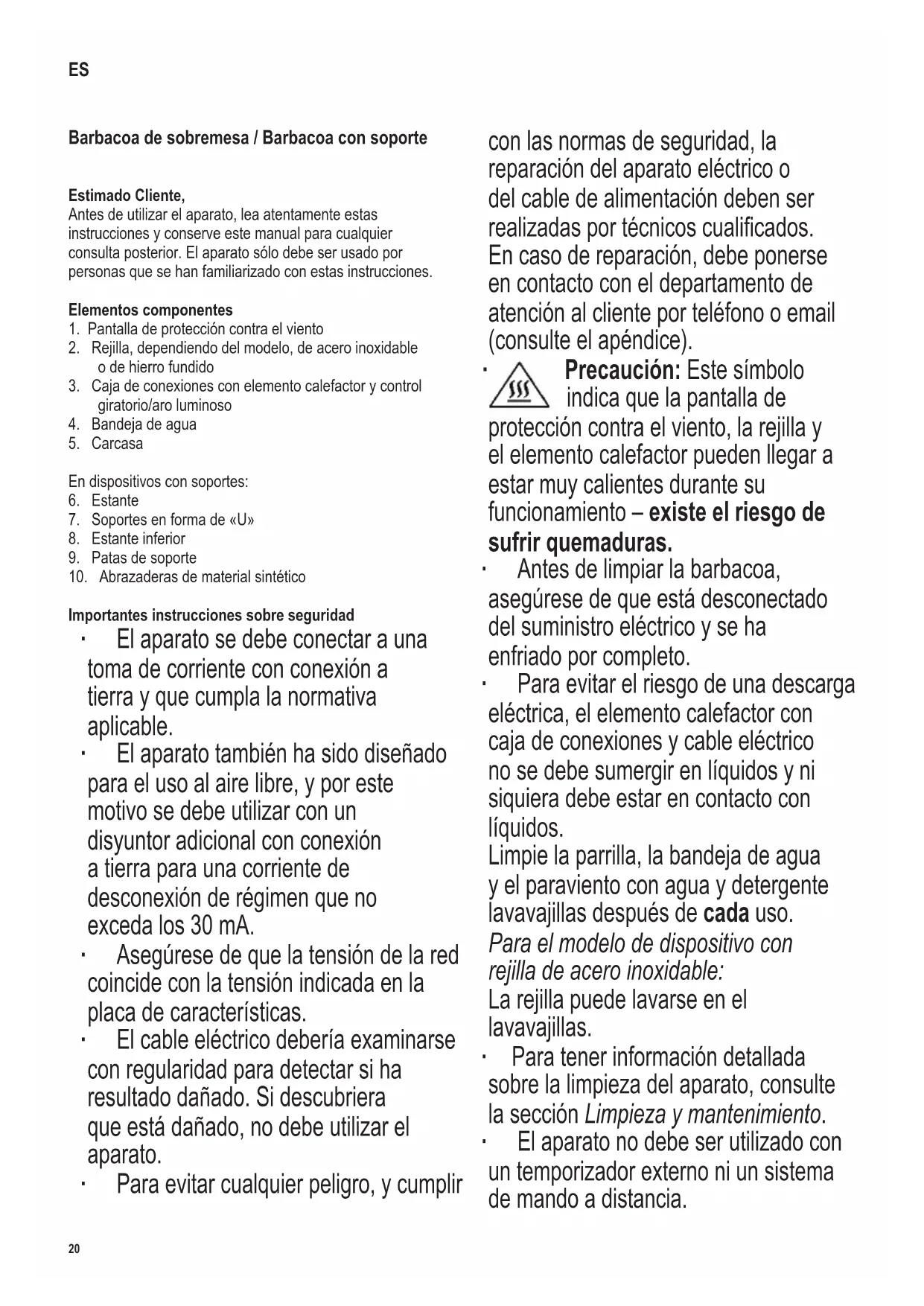 Precaución: Este símbolo indica que la pantalla de protección contra el viento, la rejilla y el elemento calefactor pueden llegar a estar muy calientes durante su funcionamiento – existe el riesgo de sufrir quemaduras. ∙ Antes de limpiar la barbacoa, asegúrese de que está desconectado del suministro eléctrico y se ha enfriado por completo. ∙ Para evitar el riesgo de una descarga eléctrica, el elemento calefactor con caja de conexiones y cable eléctrico no se debe sumergir en líquidos y ni siquiera debe estar en contacto con líquidos. Limpie la parrilla, la bandeja de agua y el paraviento con agua y detergente lavavajillas después de cada uso. Para el modelo de dispositivo con rejilla de acero inoxidable: La rejilla puede lavarse en el lavavajillas. ∙ Para tener información detallada sobre la limpieza del aparato, consulte la sección Limpieza y mantenimiento. ∙ El aparato no debe ser utilizado con un temporizador externo ni un sistema de mando a distancia. ES21 142 x 208 mm ∙ ¡Advertencia! Nunca, bajo ninguna circunstancia, utilice carbón ni ningún otro combustible sólido o líquido para que funcione la barbacoa. ∙ Cuidado: No cubra la rejilla de la barbacoa con papel de aluminio, platos de asado u otros artículos, porque la acumulación de calor resultante podría dañar gravemente la barbacoa. ∙ Se puede añadir hasta un máximo de 1,1 litro de agua en la bandeja de agua. ∙ Este aparato ha sido diseñado para el uso doméstico u otra aplicación similar, por ejemplo - en cocinas de personal, en ocinas y otros puntos comerciales, - en empresas agrícolas, - por los clientes de hoteles, pensiones, etc. y alojamientos similares, - en casas rurales. ∙ Este aparato podrá ser utilizado por niños (mayores de 8 años) y personas con reducidas facultades físicas, sensoriales o mentales, o sin experiencia ni conocimiento del producto, siempre que hayan recibido la supervisión o instrucciones referentes al uso del aparato y entiendan por completo el peligro y las precauciones de seguridad. ∙ Los niños no deben jugar con el aparato. ∙ No se debe permitir que los niños realicen ningún trabajo de limpieza o mantenimiento del aparato a menos que esté bajo vigilancia y tengan más de 8 años. ∙ El aparato y su cable eléctrico siempre se deben mantener fuera del alcance de niños menores de 8 años. ∙ Precaución: Mantenga a los niños alejados del material de embalaje, porque podría ser peligroso, existe el peligro de asxia. ∙ Antes de utilizar el aparato, se debe comprobar que tanto la unidad principal como cualquier accesorio no están defectuosos. En caso de que el aparato caiga sobre una supercie dura, por ejemplo, no se debe utilizar de nuevo: incluso los desperfectos no visibles pueden tener efectos adversos sobre la seguridad en el uso del aparato. ∙ Durante el funcionamiento, la barbacoa debe ser colocada sobre una supercie termorresistente, insensible a salpicaduras y manchas. Cuando se cocinan alimentos con un contenido alto de grasa o humedad, no se puede siempre evitar las salpicaduras. ∙ No coloque la barbacoa junto a una pared ni esquina, y compruebe que no se guarda ningún material inamable junto a la barbacoa. ∙ Cuando utilice el dispositivo en el interior, no instale la pantalla de protección contra el viento. ∙ Recuerde que los alimentos con alto contenido de grasa tienen tendencia a arder; por este motivo, siempre debe llenar la bandeja de agua con agua antes de su utilización. No conecte la barbacoa al suministro eléctrico hasta haber llenado la bandeja con agua. El agua ayuda a enfriar la bandeja de agua, reduce la cantidad de humo producido y facilita la limpieza. ∙ Asegúrese de controlar el nivel del agua. El agua debe añadirse con antelación, asegurándose de que no entra en contacto con el elemento calefactor. Precaución: Antes de añadir agua, desconecte la barbacoa de la toma de corriente. ∙ Antes de utilizar la barbacoa, asegúrese siempre de que el elemento calefactor esté correctamente instalado en la bandeja de agua y la carcasa. ∙ La barbacoa debe estar bajo supervisión en todo momento durante su funcionamiento. ∙ Recuerde que el elemento calefactor y la rejilla pueden llegar a estar muy calientes durante el funcionamiento. Incluso después de apagar el elemento calefactor, no se debe tocarlo hasta que se haya enfriado lo suciente. En caso contrario, podría sufrir graves quemaduras. ∙ No deje que el cable de alimentación entre en contacto con ninguna parte del aparato que esté caliente. ∙ Extienda el cable de alimentación de modo que nadie tropiece con el mismo.22 142 x 208 mm ∙ Desenchufe siempre el aparato de la toma de la pared - antes de llenar de agua la bandeja reectora, - después de usarlo; - en caso de alguna avería; - antes de limpiar el aparato. ∙ El uso de un cable alargador extendido o en bobina produce una pérdida de potencia en el suministro, junto con el posterior calentamiento del cable. Por ello, es necesario desenrollar el cable por completo antes de usarlo. Asegúrese de que el cable es adecuado para su uso al aire libre y para la potencia indicada (consultar la placa de características). ∙ En dispositivos con soportes: El estante soporta un peso máximo de 4 kg. ∙ No mueva la barbacoa mientras está funcionando. ∙ ¡Precaución! Antes de trasladar, limpiar o guardar la barbacoa, asegúrese de que se haya enfriado completamente. ∙ ¡Precaución! Cuando no utilice la barbacoa, retire el elemento calefactor con caja de conexiones del aparato y guárdelo en un lugar seco y protegido. ∙ Asegúrese de que las otras partes de la barbacoa no se guardan en el exterior, ni en otro lugar donde estén expuestas a temperaturas extremas o elevada humedad. ∙ No se acepta la responsabilidad si hay averías a consecuencia del uso incorrecto del aparato o si estas instrucciones no han sido observadas debidamente. ∙ Este producto cumple con las directivas ob