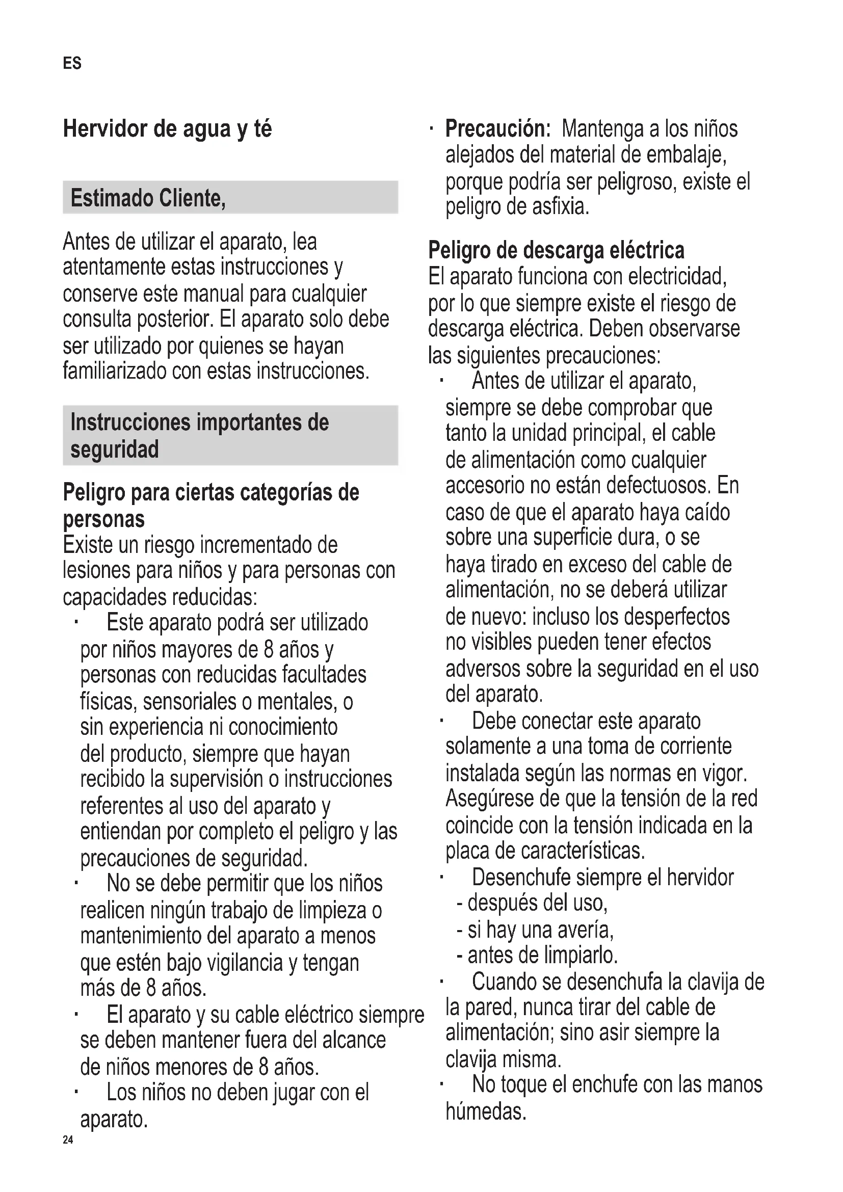 Antes de volver a llenar el aparato con agua corriente espere hasta que se haya enfriado. ∙ Coloque siempre la unidad sobre una supercie resistente al calor, antideslizante, nivelada y seca,26 142 x 208 mm que sea inmune al contacto con los pies de caucho. ∙ No ponga el aparato en funcionamiento debajo de un armario empotrado u objeto similar; el vapor emitido podría quedar atrapado debajo del armario. ∙ No permita que el cable cuelgue suelto. ∙ No retuerza ni apriete el cable de alimentación eléctrica. ∙ Mantenga ambos, el cable y el aparato lejos de fuentes de calor (por ejemplo, platos calientes, llamas de gas). Utilización correcta ∙ Este aparato debe utilizarse solo para calentar agua limpia, potable y para preparar bebidas calientes. ∙ ¡Advertencia! Cualquier otra utilización distinta a las indicadas en estas instrucciones debe ser considerada inapropiada y puede provocar lesiones personales o daños materiales. ∙ Este aparato ha sido diseñado para el uso doméstico u otra aplicación similar, por ejemplo - en cocinas de personal, en ocinas y otros puntos comerciales, - en empresas agrícolas, - por los clientes de hoteles, pensiones, etc. y alojamientos similares, - en casas rurales. ∙ No deje el aparato desatendido mientras está conectado. En caso de un aparato defectuoso Un aparato defectuoso puede causar daños materiales y lesiones