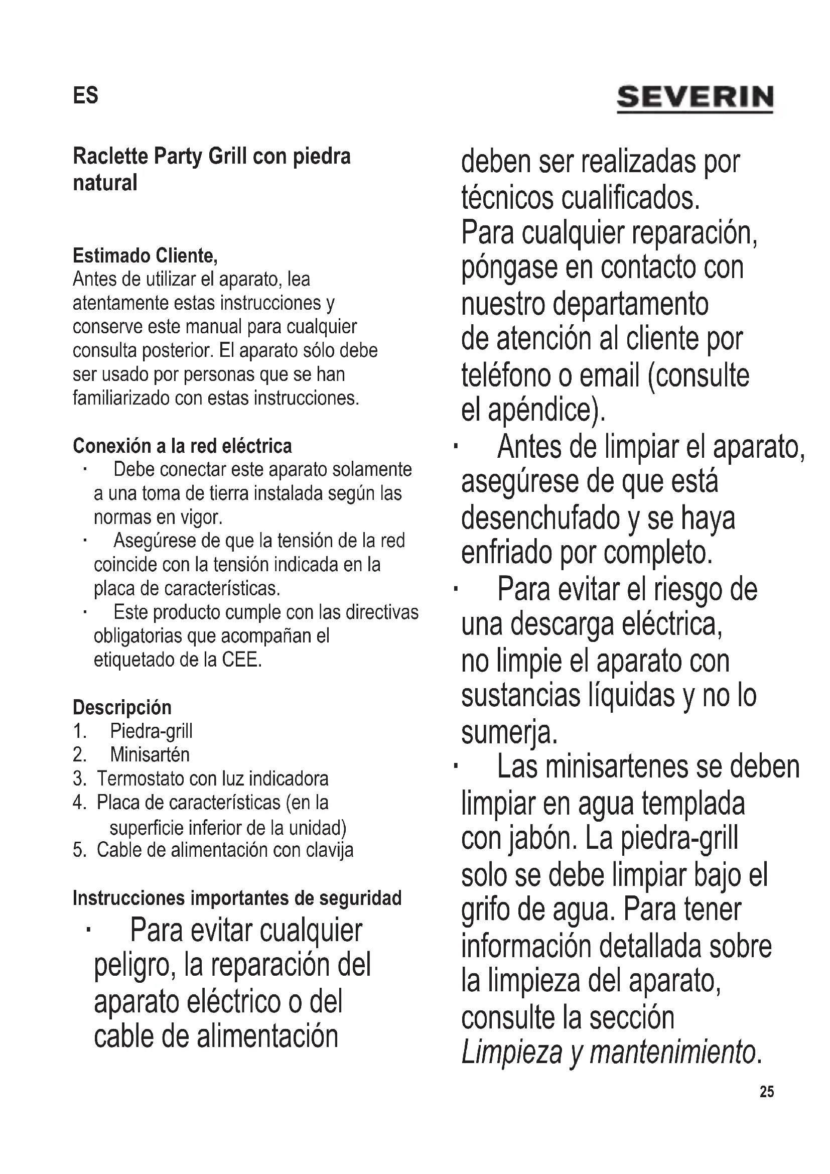 o se haya tirado en exceso del cable de alimentación, no se deberá utilizar de nuevo: incluso los desperfectos no visibles pueden tener efectos adversos sobre la seguridad en el uso del aparato. ∙ Las supercies del aparato, la piedra- grill y las minisartenes se calientan durante el uso y se mantendrán calientes durante cierto tiempo. Precaución: Peligro de quemaduras. ∙ No deje el aparato sin vigilar durante su funcionamiento. ∙ Se debe mantener el cable sucientemente alejado de las partes calientes del aparato. ∙ Durante el funcionamiento, se debe colocar el aparato sobre una supercie estable, llana y termorresistente, a prueba de salpicaduras y manchas. Cuando se cocinan alimentos con un contenido alto de grasa o humedad, no siempre se pueden evitar las salpicaduras. ∙ No coloque el grill junto a una pared ni esquina, y compruebe que no se guarda ningún material inamable junto al grill. ∙ No coloque el aparato sobre o cerca de supercies calientes tales como resistencias eléctricas, ni próximo a una salida de gas u otras fuentes de calor. ∙ Atención: No ponga el aparato en funcionamiento en el exterior. ∙ Antes de su utilización, la piedra-grill se debe colocar en el aparato sobre el elemento térmico. ∙ Desenchufe siempre el aparato - después del uso, - si hay una avería, y - antes de limpiarlo. ∙ Para desenchufar, no tire nunca del cable; coja la clavija. ∙ No se acepta responsabilidad en caso de averías debido al uso incorrecto del aparato o si estas instrucciones no han sido observadas debidamente. Aplicaciones Este aparato es un grill raclette eléctrico, que permite asar sin grasa carne, pescado y verduras y gratinar queso. Cualquier otra utilización distinta a las indicadas en estas instrucciones debe ser considerada inapropiada y puede provocar lesiones personales o daños materiales. Antes del primer uso ∙ Retire por completo todo el material de embalaje. ∙ Antes de utilizar el grill por primera vez, limpie la piedra-grill y las minisartenes con un paño húmedo. ∙ Caliente el aparato con la piedra grill y las minisartenes durante 10 minutos aproximadamente, sin incorporar ningún alimento, para eliminar el olor típico que se genera al encenderlo por primera vez (se puede apreciar cierta cantidad de humo). Por este motivo, se debe asegurar una ventilación adecuada abriendo las ventanas o el balcón. ∙ Después limpie el aparato conforme a las instrucciones de la sección Limpieza y mantenimiento.28 104 x 142 mm Piedra grill ∙ Coloque la piedra, con la cara na hacia arriba, sobre el aparato. ∙ Cuidado: Evite colocar la piedra fría sobre un elemento caliente. ∙ La piedra se puede utilizar para cocinar verduras, letes de carne o pescado, etc. según sea necesario. ∙ Esta piedra está hecha de material natural. Las pequeñas grietas producidas por la expansión y contracción durante el calentamiento y enfriamiento, así como un oscurecimiento, son normales y no tienen ningún efecto adverso. ∙ No coloque ningún alimento congelado ni alimentos que contengan vinagre (como pepinillos en vinagre o mostaza) sobre la piedra. Termostato variable y luz indicadora ∙ El termostato sirve para regular la temperatura entre MIN y MAX. ∙ La luz indicadora muestra el nivel actual de calor: Calor encendido = luz indicadora encendida Calor apagado = luz indicadora apagada ∙ Después de su uso, gire el botón del termostato hasta su posición más baja y desenchufe el aparato de la toma de pared. Funcionamiento Consejo: Para disfrutar del uso óptimo de la parrilla, la carne se debe extraer del frigoríco 30 minutos antes de asarla y se debe dejar reposar en un plato cubierto. ∙ Coloque la piedra-grill en el aparato. ∙ Enchufe el cable eléctrico en una toma de pared adecuada y gire el termostato hacia la derecha hasta el máximo. ∙ Permita que el aparato se precaliente durante 10 minutos hasta alcanzar la temperatura deseada. No obstante, la piedra-grill deberá precalentarse durante 25 minutos aproximadamente. ∙ Coloque los alimentos a cocinar sobre la piedra. ∙ Coloque el queso de raclette en las minisartenes. Coloque las minisartenes en el aparato, bajo el elemento térmico, y espere hasta que el queso se derrita. ∙ Advertencia: No coloque las minisartenes vacías en el aparato mientras está encendido. ∙ Después de cocinar los alimentos, gire el termostato hacia la izquierda hasta el máximo y desenchufe el aparato de la red eléctrica. Modo de preparación del queso en raclette Utilice unos 200-300 gr. de queso por persona. Prepare el queso en lonchas de unos 3-5 mm de grosor y colóquelas en las minisartenes. Es preferible utilizar un queso apropiado para fundir.104 x 142 mm