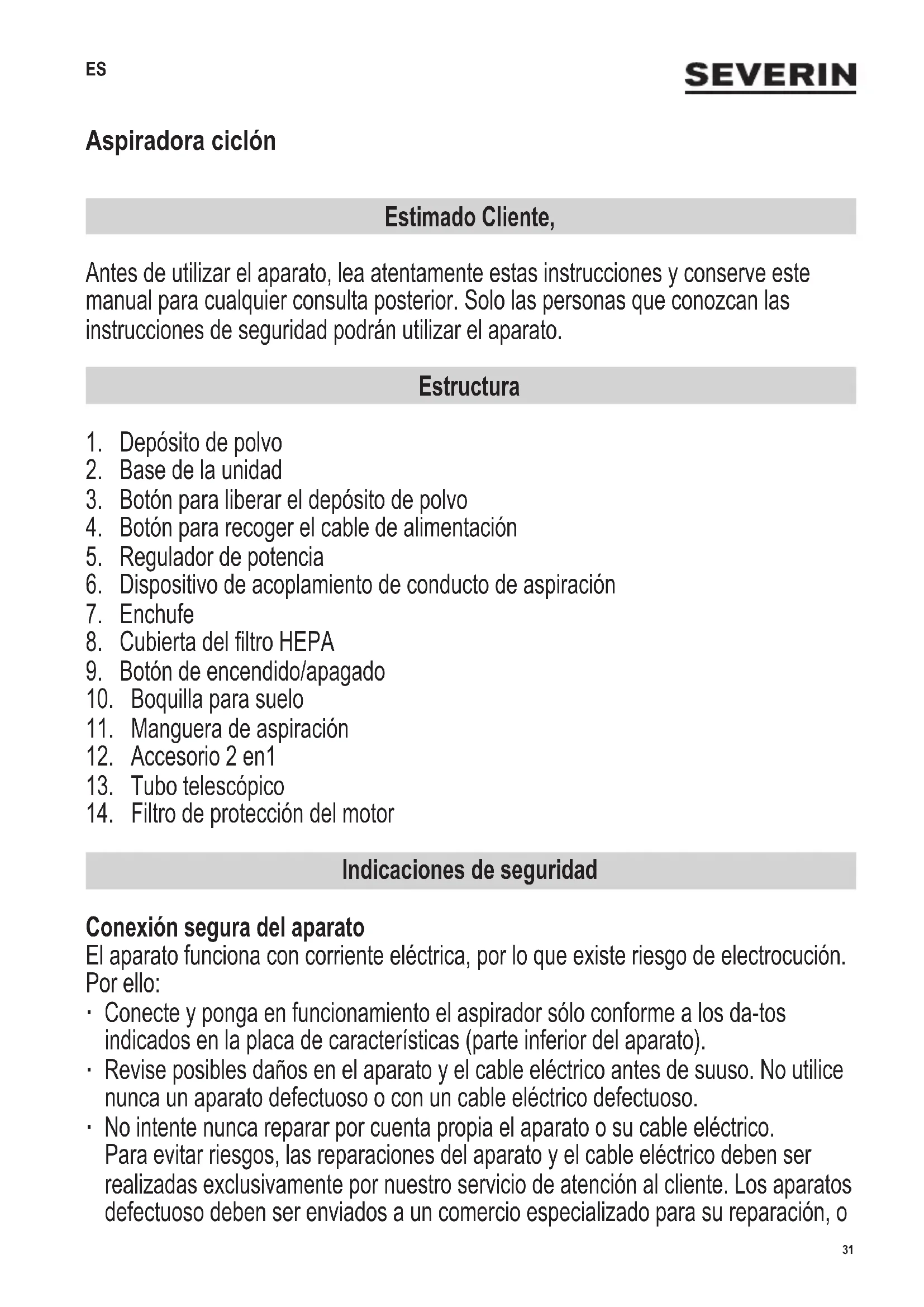 Indicaciones de seguridad Conexión segura del aparato El aparato funciona con corriente eléctrica, por lo que existe riesgo de electrocución. Por ello: ∙ Conecte y ponga en funcionamiento el aspirador sólo conforme a los da-tos indicados en la placa de características (parte inferior del aparato). ∙ Revise posibles daños en el aparato y el cable eléctrico antes de suuso. No utilice nunca un aparato defectuoso o con un cable eléctrico defectuoso. ∙ No intente nunca reparar por cuenta propia el aparato o su cable eléctrico. Para evitar riesgos, las reparaciones del aparato y el cable eléctrico deben ser realizadas exclusivamente por nuestro servicio de atención al cliente. Los aparatos defectuoso deben ser enviados a un comercio especializado para su reparación, o ES32 142 x 208 mm bien contacte con el servicio de atención al cliente de SEVERIN. ∙ No sumerja el aparato en agua ni ningún otro líquido ni lo trate conlíquido alguno. No ponga en funcionamiento el aparato al aire libre o en espacios con una elevada humedad ambiental. No toque el conector con las manos mojadas. ∙ Asegúrese de extraer el cable de alimentación de la unidad solo hasta la primera marca. ∙ Preste atención a que el cable eléctrico no esté doblado, aprisionado ni pase nada por encima, tampoco debe entrar en contacto con fuentes de calor, humedad o bordes alados. Preste atención a que el cable de la fuente de alimentación no pueda causar tropiezos. ∙ No estire ni transporte el aparato cogiéndolo por el cable eléctrico.Para quitar el conector de la toma de corriente, tire siempre directamente del conector. Si es posible, no utilice cables de prolongación. Si resulta inevitable, utilice sólo cables alargadores simples con la marca de seguridad GS (no tomas de corriente múltiples) diseñados para el consumo de potencia del aparato. ∙ Antes de limpiar o realizar el mantenimiento del aparato, así comoantes de cambiar los accesorios, se debe apagar el aparato y desenchufarlo de la toma de corriente. Seguridad de determinados grupos de personas ∙ Este aparato puede ser utilizado por niños mayores de ocho años,así como por personas con capacidades físicas, sensoriales o mentales reducidas o con falta de experiencia o conocimientos bajo supervisión o si han sido debidamente instruidos sobre el uso seguro del aparato y los riesgos derivados del mismo. ∙ Los niños no deben jugar con el aparato ni colocarse o sentarse en-cima. La limpieza y el mantenimiento no deben ser realizados por niños sin supervisión. Los niños menores de ocho años deben mantenerse alejados del aparato y del cable eléctrico. ∙ Mantenga los materiales de embalaje fuera del alcance de los niñosy deséchelos. De lo contrario existe riesgo de asxia. Uso previsto El aparato debe utilizarse únicamente en el ámbito doméstico. El aparato debe utilizarse exclusivamente para aspirar suelos secos, con una suciedad normal o dependiendo de los accesorios, también muebles y cojines. Cualquier otro uso se considera no adecuado y está prohibido. Para prevenir lesiones, quemaduras o daños, el aparato no debe utilizarse para aspirar:33 142 x 208 mm ∙ Sobre personas, animales o plantas. Las boquillas y aberturas de aspi-ración siempre deben mantenerse alejadas de cualquier parte del cuerpo, del pelo y de las prendas de vestir. No aspirar cerca de la cabeza. ∙ Partículas al rojo vivo, incandescentes o ardiendo (como por ejem-plo, cenizas, carbón, brasas, cigarrillos o cerillas). ∙ Materiales explosivos o fácilmente inamables o tóner. ∙ Agua y otros líquidos, por ejemplo producto limpiador de moquetashúmedo. ∙ Objetos alados como esquirlas de vidrio, clavos o escombros. ∙ Polvo no como yeso, cemento, polvo de taladro muy no, polvo. Marca CE El dispositivo cumple con las directivas de la UE que son vinculantes a la marca CE. Uso del aparato Antes de la primera puesta en marcha ∙ Retire cualquier resto de embalaje que esté por fuera o por dentro de la unidad. ∙ Monte el aparato como se indica a continuación y compruebe que el depósito de polvo y los ltros están instalados correctamente (consulte «Vaciado del depósito de polvo» y «Limpieza o sustitución de los ltros». Montaje ∙ Las piezas del aparato sólo deben montarse si el conector está desenchufado de la toma de co-Montaje rriente. ∙ Coloque el depósito de polvo en el dispositivo hasta que oiga un clic. ∙ Conecte la manguera de aspiración al aparato y encájela con un cuarto de vuelta. ∙ Introduzca el tubo telescópico en la manguera hasta que oiga un clic y ajústelo a la longitud deseada. ∙ Seleccione la boquilla en función de la supercie a aspirar: La boquilla conmutable dispone de 2 posiciones ajustables: La posición 1 es ideal para aspirar suciedad y bras de suelosenmoquetados, alfombras, etc., así como para limpiarlos en profundidad. La posición 2 es ideal para suelos duros lisos de todo tipo. El accesorio 2 en 1 con el cepillo plegado es perfecto para los recovecos del sofá y para otros espacios de difícil acceso. Con el cepillo desplegado, podrá aspirar muebles. ∙ No utilice las boquillas que estén estropeadas, para evitar dañar las supercies.34 142 x 208 mm Aspirado ∙ Especialmente al aspirar escaleras, procure que el aparato quede siempre por debajo. De loAspirado contrario, el aparato podría caer y provocarle lesiones. ∙ Si utiliza un cepillo con cerdas giratorias, manténgalo siempre alejado de personas, animales y plantas, así como de cables y tuberías. ∙ No utilice el aparato sin haber colocado una bolsa para el polvo y los ltros. ∙ Monte el aparato, conecte el enchufe a la red y enciéndalo. ∙ Es necesario respetar las indicaciones de limpieza y conservación de los fabricantes del pavimento, la alfombra o los muebles. ∙ Si aspira por descuido cortinas u objetos similares, abra rápidamente el regulador de aire adicional para liberarlos. ∙ Asegúrese de que la potencia de 
