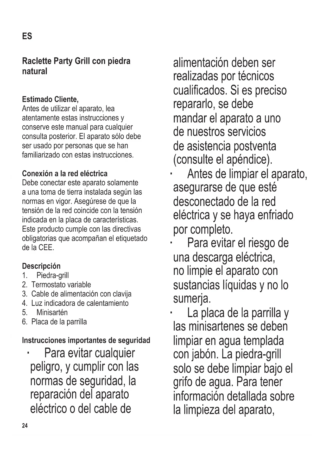 Instrucciones importantes de seguridad ∙ Para evitar cualquier peligro, y cumplir con las normas de seguridad, la reparación del aparato eléctrico o del cable de alimentación deben ser realizadas por técnicos cualicados. Si es preciso repararlo, se debe mandar el aparato a uno de nuestros servicios de asistencia postventa (consulte el apéndice). ∙ Antes de limpiar el aparato, asegurarse de que esté desconectado de la red eléctrica y se haya enfriado por completo. ∙ Para evitar el riesgo de una descarga eléctrica, no limpie el aparato con sustancias líquidas y no lo sumerja. ∙ La placa de la parrilla y las minisartenes se deben limpiar en agua templada con jabón. La piedra-grill solo se debe limpiar bajo el grifo de agua. Para tener información detallada sobre la limpieza del aparato, ES104 x 142 mm
