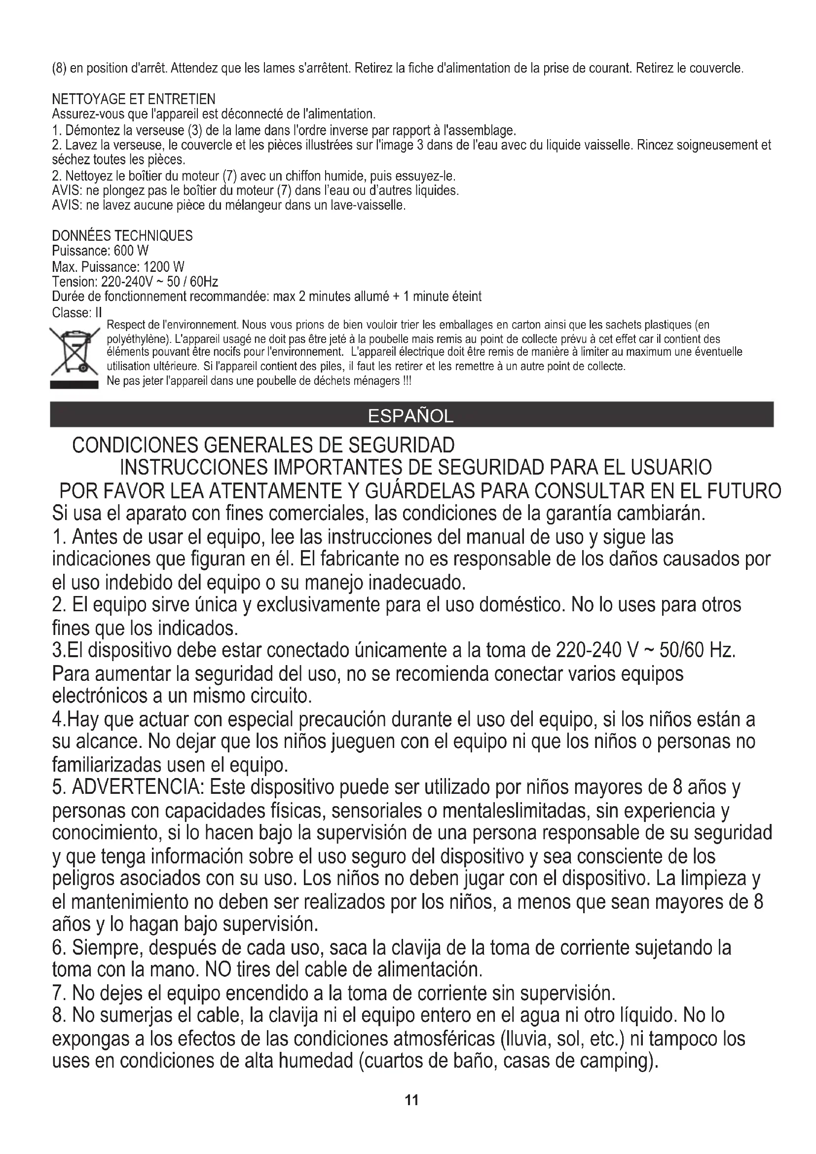 personas con capacidades físicas, sensoriales o mentaleslimitadas, sin experiencia y conocimiento, si lo hacen bajo la supervisión de una persona responsable de su seguridad y que tenga información sobre el uso seguro del dispositivo y sea consciente de los peligros asociados con su uso. Los niños no deben jugar con el dispositivo. La limpieza y el mantenimiento no deben ser realizados por los niños, a menos que sean mayores de 8 años y lo hagan bajo supervisión. 4.Hay que actuar con especial precaución durante el uso del equipo, si los niños están a su alcance. No dejar que los niños jueguen con el equipo ni que los niños o personas no familiarizadas usen el equipo. Respect de l'environnement. Nous vous prions de bien vouloir trier les emballages en carton ainsi que les sachets plastiques (en polyéthylène). L'appareil usagé ne doit pas être jeté à la poubelle mais remis au point de collecte prévu à cet effet car il contient des éléments pouvant être nocifs pour l'environnement. L'appareil électrique doit être remis de manière à limiter au maximum une éventuelle utilisation ultérieure. Si l'appareil contient des piles, il faut les retirer et les remettre à un autre point de collecte. Ne pas jeter l'appareil dans une poubelle de déchets ménagers !!! ESPAÑOL12 17.No introduzca los dedos u otros objetos en el vaso de la licuadora cuando el dispositivo está encendido. 18.Tenga cuidado con las cuchillas para evitar lesiones. 19.Tenga cuidado para que el vaso y los elementos de trabajo del dispositivo no se bloquean con el pelo largo, bufandas, corbatas, etc. No utilice detergentes fuertes para lavar la carcasa, ya que pueden eliminar la información aplicada de los símbolos gráficos, tales como: escalas, signos, señales de advertencia, etc. 25.El dispositivo no es adecuado para montar claras, amasar o picar carne. 22.No lave ninguna parte de la licuadora en el lavavajillas. 16.Evite el contacto de la parte de motor con el agua y otros líquidos.