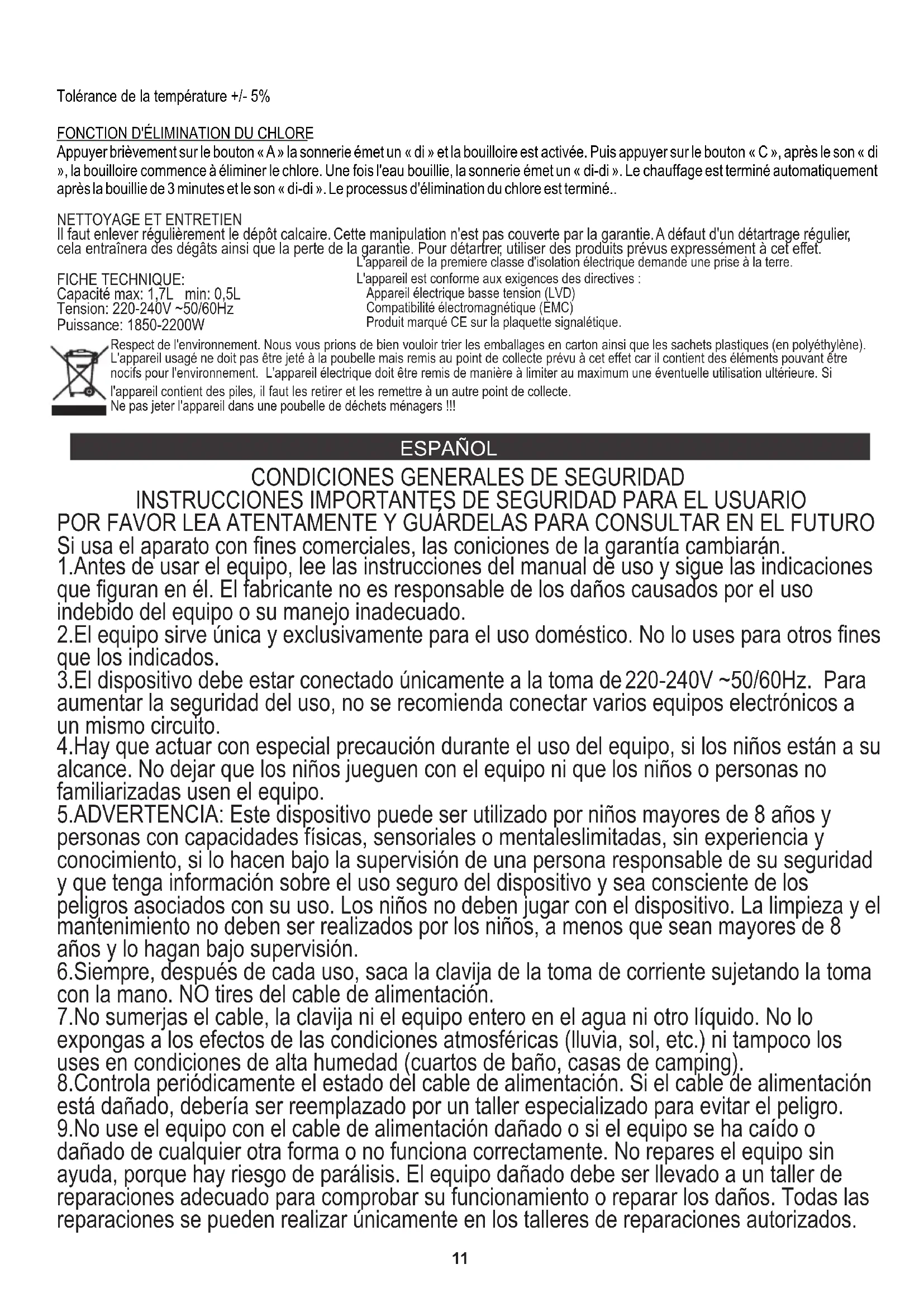 6.Siempre, después de cada uso, saca la clavija de la toma de corriente sujetando la toma con la mano. NO tires del cable de alimentación. FICHE TECHNIQUE: Il faut enlever régulièrement le dépôt calcaire. Cette manipulation n'est pas couverte par la garantie. A défaut d'un détartrage régulier, cela entraînera des dégâts ainsi que la perte de la garantie. Pour détartrer, utiliser des produits prévus expressément à cet effet. 2.El equipo sirve única y exclusivamente para el uso doméstico. No lo uses para otros fines que los indicados. Appuyer brièvement sur le bouton « A » la sonnerie émet un « di » et la bouilloire est activée. Puis appuyer sur le bouton « C », après le son « di », la bouilloire commence à éliminer le chlore. Une fois l'eau bouillie, la sonnerie émet un « di-di ». Le chauffage est terminé automatiquement après la bouillie de 3 minutes et le son « di-di ». Le processus d'élimination du chlore est terminé.. 8.Controla periódicamente el estado del cable de alimentación. Si el cable de alimentación está dañado, debería ser reemplazado por un taller especializado para evitar el peligro. 9.No use el equipo con el cable de alimentación dañado o si el equipo se ha caído o dañado de cualquier otra forma o no funciona correctamente. No repares el equipo sin ayuda, porque hay riesgo de parálisis. El equipo dañado debe ser llevado a un taller de reparaciones adecuado para comprobar su funcionamiento o reparar los daños. Todas las reparaciones se pueden realizar únicamente en los talleres de reparaciones autorizados. Capacité max: 1,7L min: 0,5L POR FAVOR LEA ATENTAMENTE Y GUÁRDELAS PARA CONSULTAR EN EL FUTURO Si usa el aparato con fines comerciales, las coniciones de la garantía cambiarán.