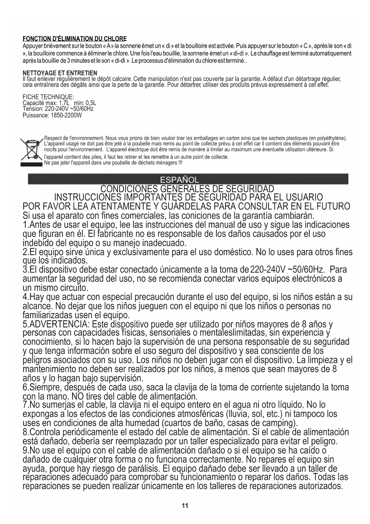 1.Antes de usar el equipo, lee las instrucciones del manual de uso y sigue las indicaciones que figuran en él. El fabricante no es responsable de los daños causados por el uso indebido del equipo o su manejo inadecuado. 8.Controla periódicamente el estado del cable de alimentación. Si el cable de alimentación está dañado, debería ser reemplazado por un taller especializado para evitar el peligro. POR FAVOR LEA ATENTAMENTE Y GUÁRDELAS PARA CONSULTAR EN EL FUTURO 2.El equipo sirve única y exclusivamente para el uso doméstico. No lo uses para otros fines que los indicados. 9.No use el equipo con el cable de alimentación dañado o si el equipo se ha caído o dañado de cualquier otra forma o no funciona correctamente. No repares el equipo sin ayuda, porque hay riesgo de parálisis. El equipo dañado debe ser llevado a un taller de reparaciones adecuado para comprobar su funcionamiento o reparar los daños. Todas las reparaciones se pueden realizar únicamente en los talleres de reparaciones autorizados. 6.Siempre, después de cada uso, saca la clavija de la toma de corriente sujetando la toma con la mano. NO tires del cable de alimentación. 5.ADVERTENCIA: Este dispositivo puede ser utilizado por niños mayores de 8 años y personas con capacidades físicas, sensoriales o mentaleslimitadas, sin experiencia y conocimiento, si lo hacen bajo la supervisión de una persona responsable de su seguridad y que tenga información sobre el uso seguro del dispositivo y sea consciente de los peligros asociados con su uso. Los niños no deben jugar con el dispositivo. La limpieza y el mantenimiento no deben ser realizados por los niños, a menos que sean mayores de 8 años y lo hagan bajo supervisión. Si usa el aparato con fines comerciales, las coniciones de la garantía cambiarán. 3.El dispositivo debe estar conectado únicamente a la toma de 220-240V ~50/60Hz. Para aumentar la seguridad del uso, no se recomienda conectar varios equipos electrónicos a un mismo circuito. 7.No sumerjas el cable, la clavija ni el equipo entero en el agua ni otro líquido. No lo expongas a los efectos de las condiciones atmosféricas (lluvia, sol, etc.) ni tampoco los uses en condiciones de alta humedad (cuartos de baño, casas de camping). INSTRUCCIONES IMPORTANTES DE SEGURIDAD PARA EL USUARIO 4.Hay que actuar con especial precaución durante el uso del equipo, si los niños están a su alcance. No dejar que los niños jueguen con el equipo ni que los niños o personas no familiarizadas usen el equipo. ESPAÑOL Ne pas jeter l'appareil dans une poubelle de déchets ménagers !!! Respect de l'environnement. Nous vous prions de bien vouloir trier les emballages en carton ainsi que les sachets plastiques (en polyéthylène). L'appareil usagé ne doit pas être jeté à la poubelle mais remis au point de collecte prévu à cet effet car il contient des éléments pouvant être nocifs pour l'environnement. L'appareil électrique doit être remis de manière à limiter au maximum une éventuelle utilisation ultérieure. Si l'appareil contient des piles, il faut les retirer et les remettre à un autre point de collecte.12