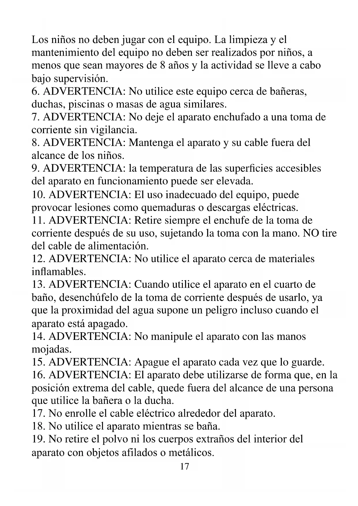 13. ADVERTENCIA: Cuando utilice el aparato en el cuarto de