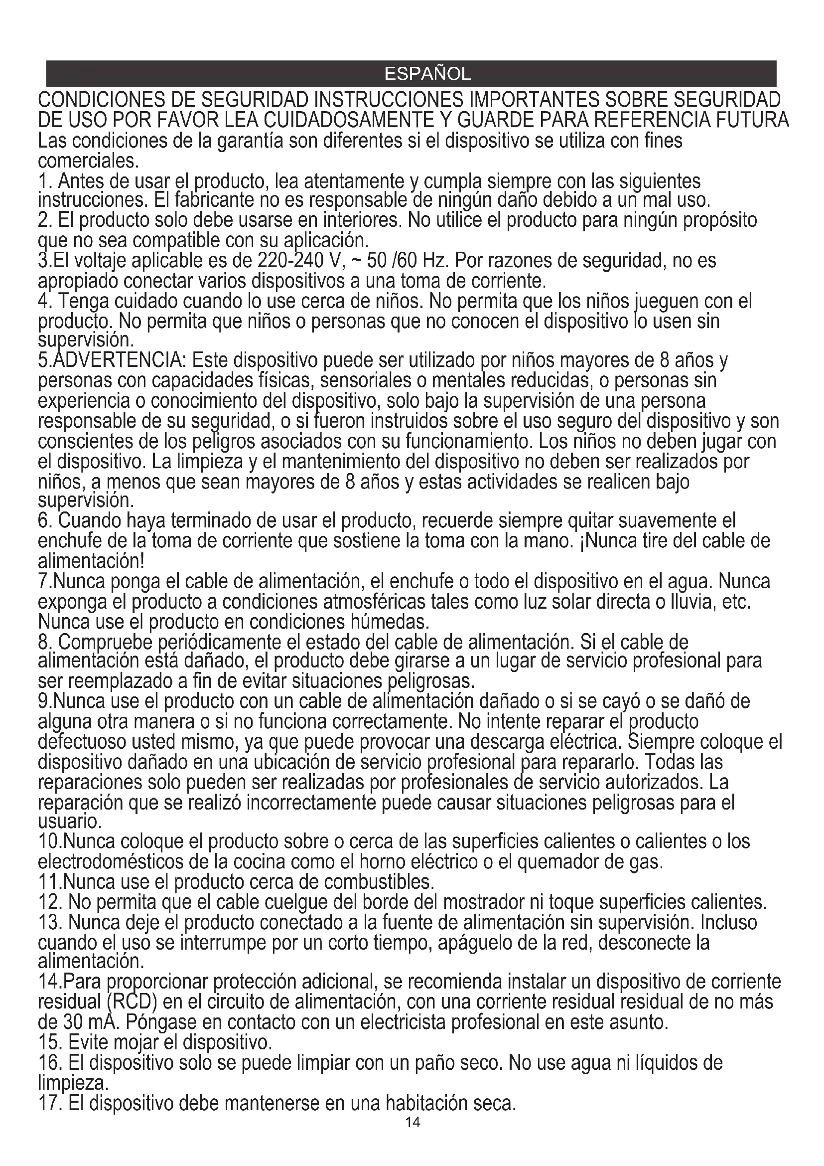 16. El dispositivo solo se puede limpiar con un paño seco. No use agua ni líquidos de