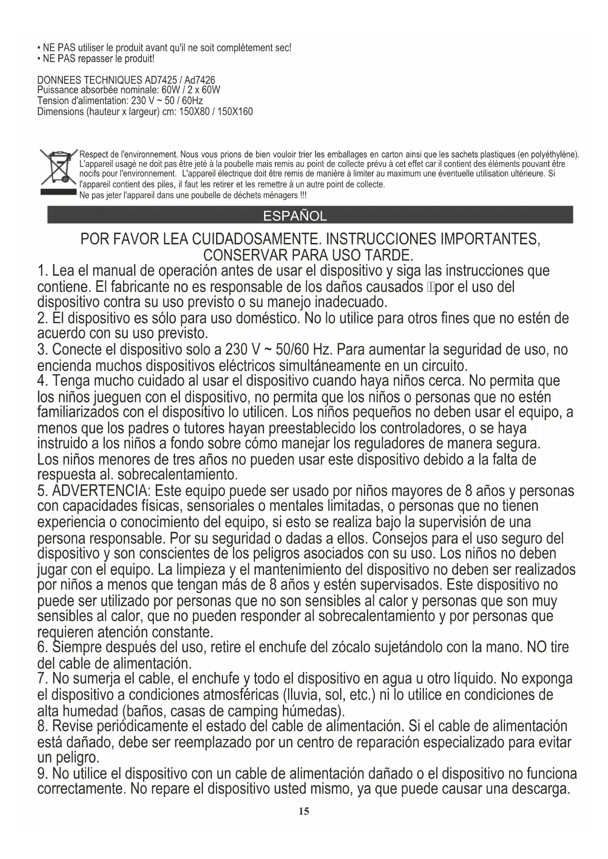 - ¡NO planche el producto! DATOS TÉCNICOS AD7425 / Ad7426 Entrada de potencia nominada: 60W / 2 x 60W Voltaje de alimentación: 230 V ~ 50 / 60Hz Dimensiones (alto x ancho) cm: 150X80 / 150X160 Preocupación por el medio ambiente. Por favor, lleva las cajas de cartón a un sitio de reciclaje. Las bolsas de polietileno se deben tirar al cubo de la basura amarillo (para envases). El equipo gastado debe ser entregado en el punto de almacenamiento adecuado, porque las piezas que constituyen el equipo pueden suponer un peligro para el medio ambiente. Debes entregar el equipo Hay que devolver el equipo eléctrico con el fin de evitar su reutilización. Si en el equipo se encuentran pilas, hay que sacarlas y entregar por separado, en un punto de almacenamiento adecuado. No tires el equipo al contenedor para residuos urbanos!! 17PORTUGUÊS POR FAVOR, LEIA ATENTAMENTE. INSTRUÇÕES IMPORTANTES, GUARDAR PARA USO POSTERIOR.