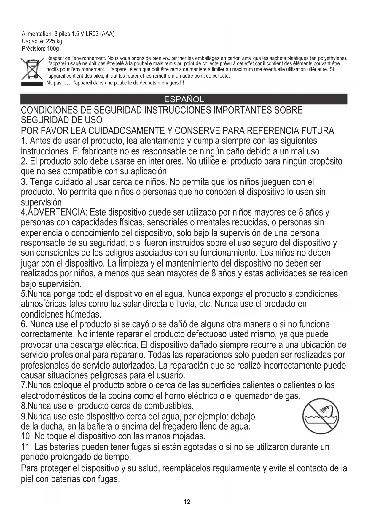 Para proteger el dispositivo y su salud, reemplácelos regularmente y evite el contacto de la piel con baterías con fugas. 9.Nunca use este dispositivo cerca del agua, por ejemplo: debajo de la ducha, en la bañera o encima del fregadero lleno de agua.
