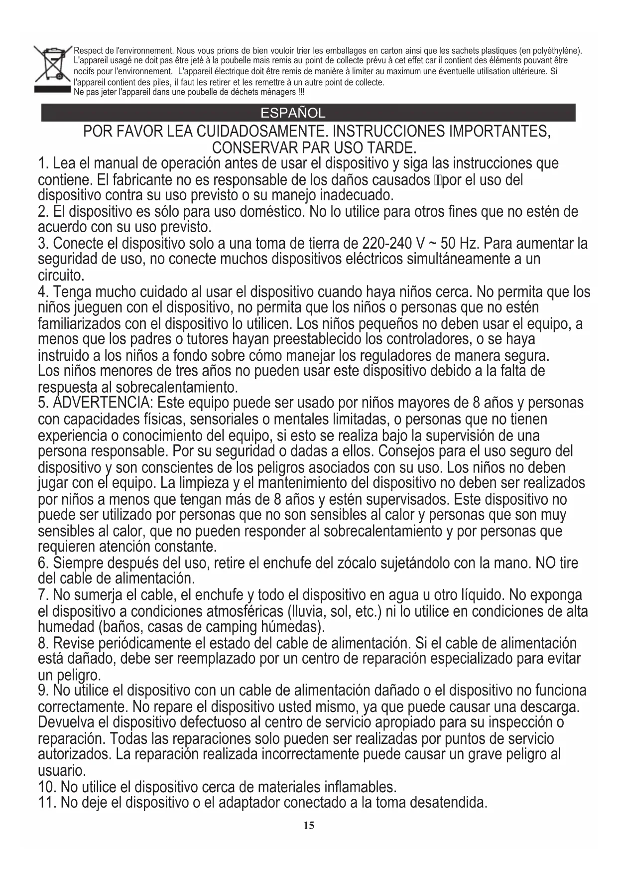 contiene. El fabricante no es responsable de los daños causados por el uso del dispositivo contra su uso previsto o su manejo inadecuado. Respect de l'environnement. Nous vous prions de bien vouloir trier les emballages en carton ainsi que les sachets plastiques (en polyéthylène). L'appareil usagé ne doit pas être jeté à la poubelle mais remis au point de collecte prévu à cet effet car il contient des éléments pouvant être nocifs pour l'environnement. L'appareil électrique doit être remis de manière à limiter au maximum une éventuelle utilisation ultérieure. Si l'appareil contient des piles, il faut les retirer et les remettre à un autre point de collecte. Ne pas jeter l'appareil dans une poubelle de déchets ménagers !!! ESPAÑOL 1515. El dispositivo debe estar apagado cada vez que lo sueltes.