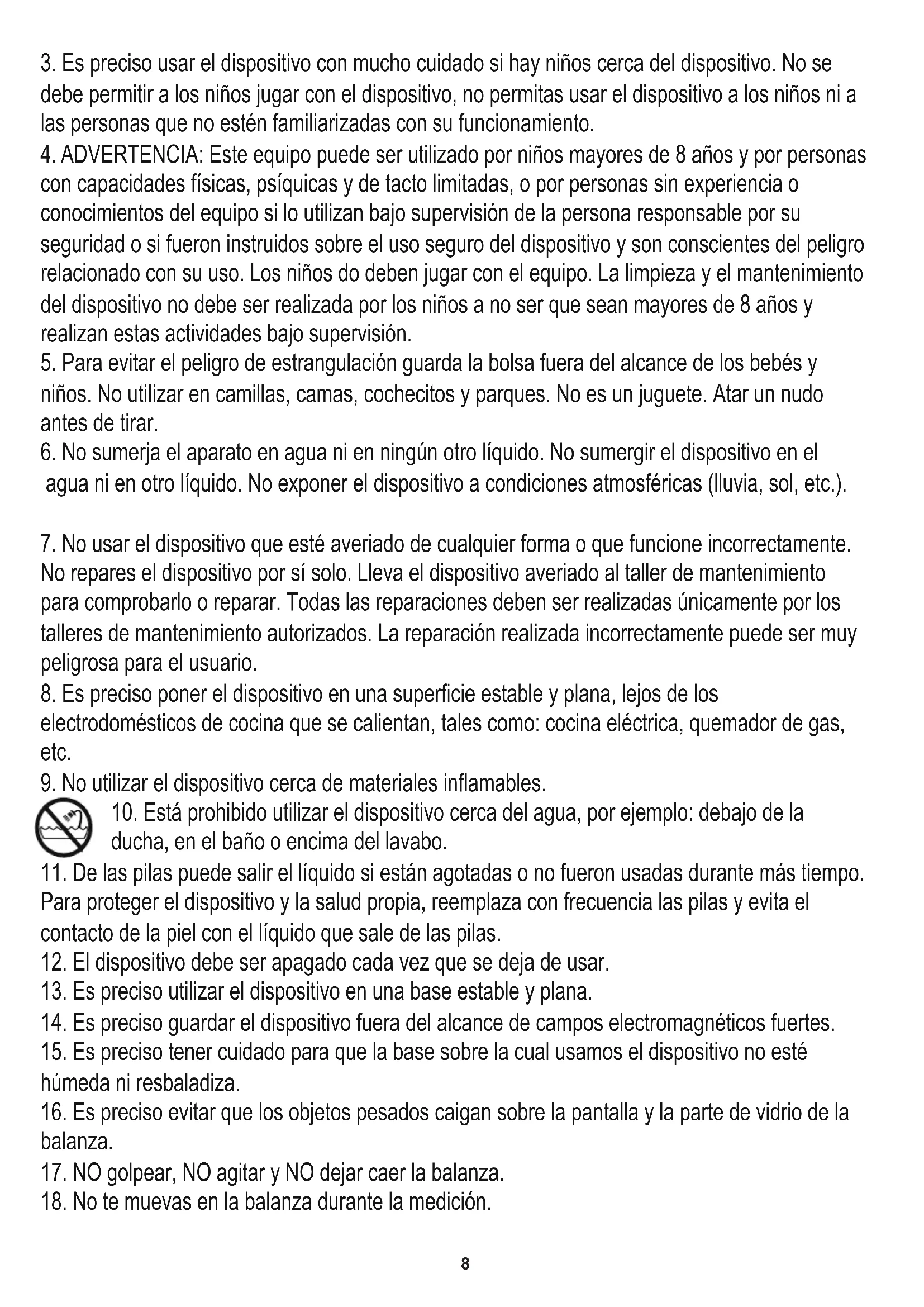 Alimentación: batería tipo 1x CR2032 3V Carga máxima: 150 kg Exactitud: 100 g Preocupación por el medio ambiente. Por favor, lleva las cajas de cartón a un sitio de reciclaje. Las bolsas de polietileno se deben tirar al cubo de la basura amarillo (para envases). El equipo gastado debe ser entregado en el punto de almacenamiento adecuado, porque las piezas que constituyen el equipo pueden suponer un peligro para el medio ambiente. Debes entregar el equipo Hay que devolver el equipo eléctrico con el fin de evitar su reutilización. Si en el equipo se encuentran pilas, hay que sacarlas y entregar por separado, en un punto de almacenamiento adecuado. No tires el equipo al contenedor para residuos urbanos!! PORTUGUÊS CONDIÇÕES DE SEGURANÇA.INSTRUÇÕES IMPORTANTES PARA A SEGURANÇA DO USOPOR FAVOR, LEIA CUIDADOSAMENTE E GUARDE PARA O FUTURO