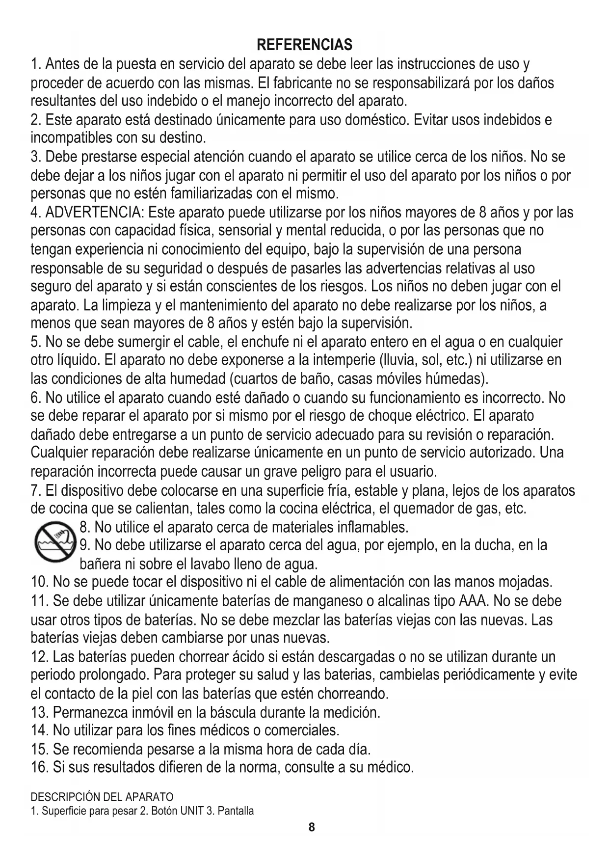 9. No debe utilizarse el aparato cerca del agua, por ejemplo, en la ducha, en la