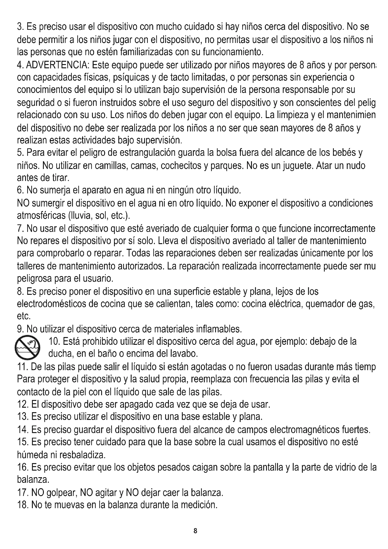 10. Está prohibido utilizar el dispositivo cerca del agua, por ejemplo: debajo de la