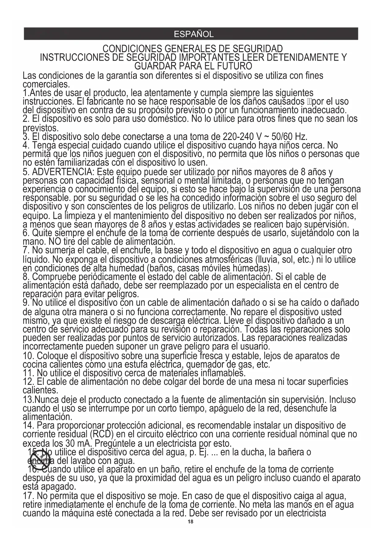15. No utilice el dispositivo cerca del agua, p. Ej. ... en la ducha, la bañera o