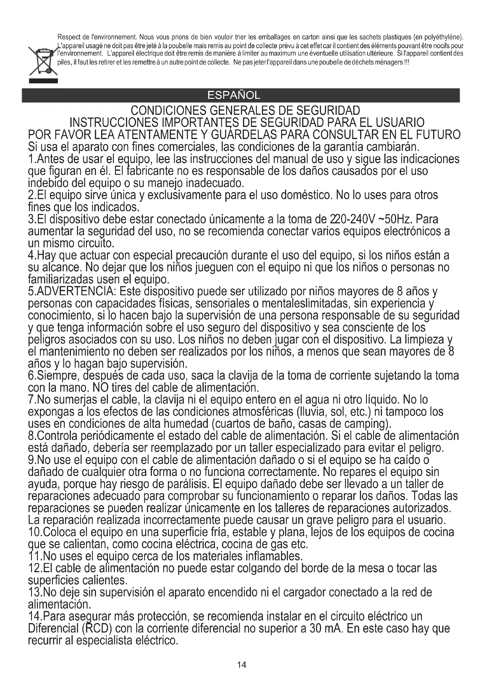 INSTRUCCIONES IMPORTANTES DE SEGURIDAD PARA EL USUARIO POR FAVOR LEA ATENTAMENTE Y GUÁRDELAS PARA CONSULTAR EN EL FUTURO Si usa el aparato con fines comerciales, las condiciones de la garantía cambiarán. 1.Antes de usar el equipo, lee las instrucciones del manual de uso y sigue las indicaciones que figuran en él. El fabricante no es responsable de los daños causados por el uso indebido del equipo o su manejo inadecuado. 2.El equipo sirve única y exclusivamente para el uso doméstico. No lo uses para otros fines que los indicados. 3.El dispositivo debe estar conectado únicamente a la toma de 220-240V ~50Hz. Para aumentar la seguridad del uso, no se recomienda conectar varios equipos electrónicos a un mismo circuito. 4.Hay que actuar con especial precaución durante el uso del equipo, si los niños están a su alcance. No dejar que los niños jueguen con el equipo ni que los niños o personas no familiarizadas usen el equipo. 5.ADVERTENCIA: Este dispositivo puede ser utilizado por niños mayores de 8 años y personas con capacidades físicas, sensoriales o mentaleslimitadas, sin experiencia y conocimiento, si lo hacen bajo la supervisión de una persona responsable de su seguridad y que tenga información sobre el uso seguro del dispositivo y sea consciente de los peligros asociados con su uso. Los niños no deben jugar con el dispositivo. La limpieza y el mantenimiento no deben ser realizados por los niños, a menos que sean mayores de 8 años y lo hagan bajo supervisión. 6.Siempre, después de cada uso, saca la clavija de la toma de corriente sujetando la toma con la mano. NO tires del cable de alimentación. 7.No sumerjas el cable, la clavija ni el equipo entero en el agua ni otro líquido. No lo expongas a los efectos de las condiciones atmosféricas (lluvia, sol, etc.) ni tampoco los uses en condiciones de alta humedad (cuartos de baño, casas de camping). 8.Controla periódicamente el estado del cable de alimentación. Si el cable de alimentación está dañado, debería ser reemplazado por un taller especializado para evitar el peligro. 9.No use el equipo con el cable de alimentación dañado o si el equipo se ha caído o dañado de cualquier otra forma o no funciona correctamente. No repares el equipo sin ayuda, porque hay riesgo de parálisis. El equipo dañado debe ser llevado a un taller de reparaciones adecuado para comprobar su funcionamiento o reparar los daños. Todas las reparaciones se pueden realizar únicamente en los talleres de reparaciones autorizados. La reparación realizada incorrectamente puede causar un grave peligro para el usuario. 10.Coloca el equipo en una superficie fría, estable y plana, lejos de los equipos de cocina que se calientan, como cocina eléctrica, cocina de gas etc. 11.No uses el equipo cerca de los materiales inflamables. 12.El cable de alimentación no puede estar colgando del borde de la mesa o tocar las superficies calientes. 13.No deje sin supervisión el aparato encendido ni el cargador conectado a la red de alimentación. 14.Para asegurar más protección, se recomienda instalar en el circuito eléctrico un Diferencial (RCD) con la corriente diferencial no superior a 30 mA. En este caso hay que recurrir al especialista eléctrico.15