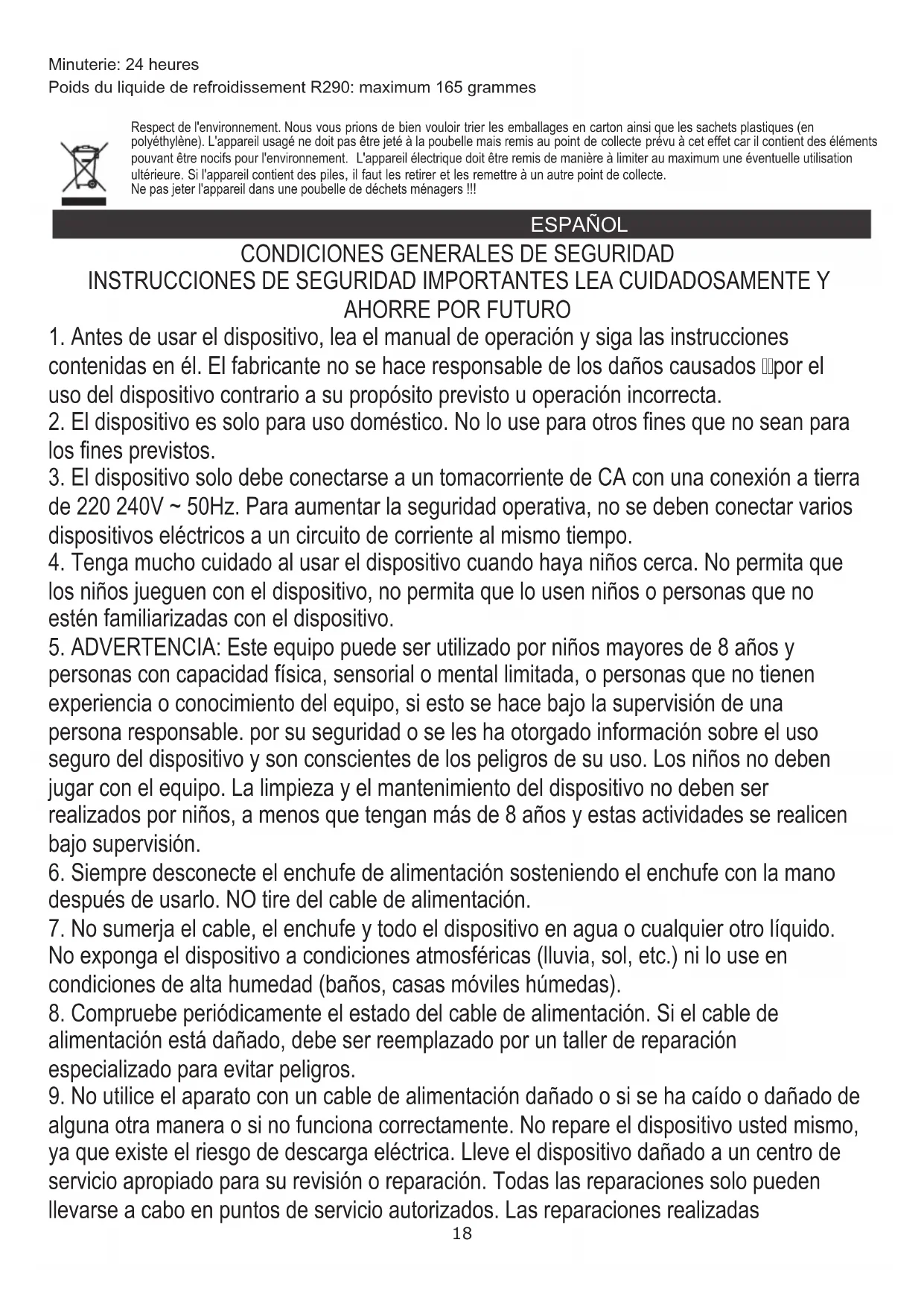 Problema I .: El aire acondicionado no funciona. Razón 1: no hay electricidad. Entonces, enciéndalo después de conectarlo a un enchufe con electricidad. Motivo 2: la lámpara de control de agua completa muestra "WF". Entonces, descarga el agua. Problema II .: el dispositivo se reinicia automáticamente con frecuencia. Motivo1: luz solar directa. Entonces, corren las cortinas. Razón 2: las puertas y ventanas están abiertas, muchas fuentes de calor en la habitación. Por lo tanto, cierre la puerta y las ventanas, retire las fuentes de calor. Motivo 3: los filtros están demasiado sucios. Entonces, limpie o reemplace los filtros. Razón 4: La entrada o salida de aire está bloqueada. Entonces, elimine el bloqueo. Problema III .: gran ruido Motivo: el dispositivo no se coloca sobre una superficie plana. Por lo tanto, coloque el dispositivo en un lugar plano y duro para reducir el ruido. Problema IV .: el compresor no funciona. Motivo: la protección de retardo de tiempo del compresor se activa. Por lo tanto, espere 3 minutos hasta que baje la temperatura y luego reinicie la máquina. Nota: cuando ocurran situaciones anormales, apague la máquina y desconecte el enchufe, luego póngase en contacto con un servicio profesional para obtener ayuda. No repare el dispositivo usted mismo. La reparación no calificada anulará la garantía. DATOS TÉCNICOS: Capacidad de enfriamiento a BTU: 7000 BTU / hora Capacidad de enfriamiento en vatios: 2050W Consumo de energía (enfriamiento) en vatios: 780 W Nivel de ruido: <= 65dB Flujo de aire: 300 m3 / hora Clase energética: A Capacidad de secado: 17 litros / 24 horas. Temporizador: 24 horas. Peso del refrigerante R290: máximo 165 gramos Preocupación por el medio ambiente. Por favor, lleva las cajas de cartón a un sitio de reciclaje. Las bolsas de polietileno se deben tirar al cubo de la basura amarillo (para envases). El equipo gastado debe ser entregado en el punto de almacenamiento adecuado, porque las piezas que constituyen el equipo pueden suponer un peligro para el medio ambiente. Debes entregar el equipo Hay que devolver el equipo eléctrico con el fin de evitar su reutilización. Si en el equipo se encuentran pilas, hay que sacarlas y entregar por separado, en un punto de almacenamiento adecuado. No tires el equipo al contenedor para residuos urbanos!! Precaución, riesgo de incendio. NO perforar ni quemar. Tenga en cuenta que el refrigerante puede no contener olor. PORTUGUÊS