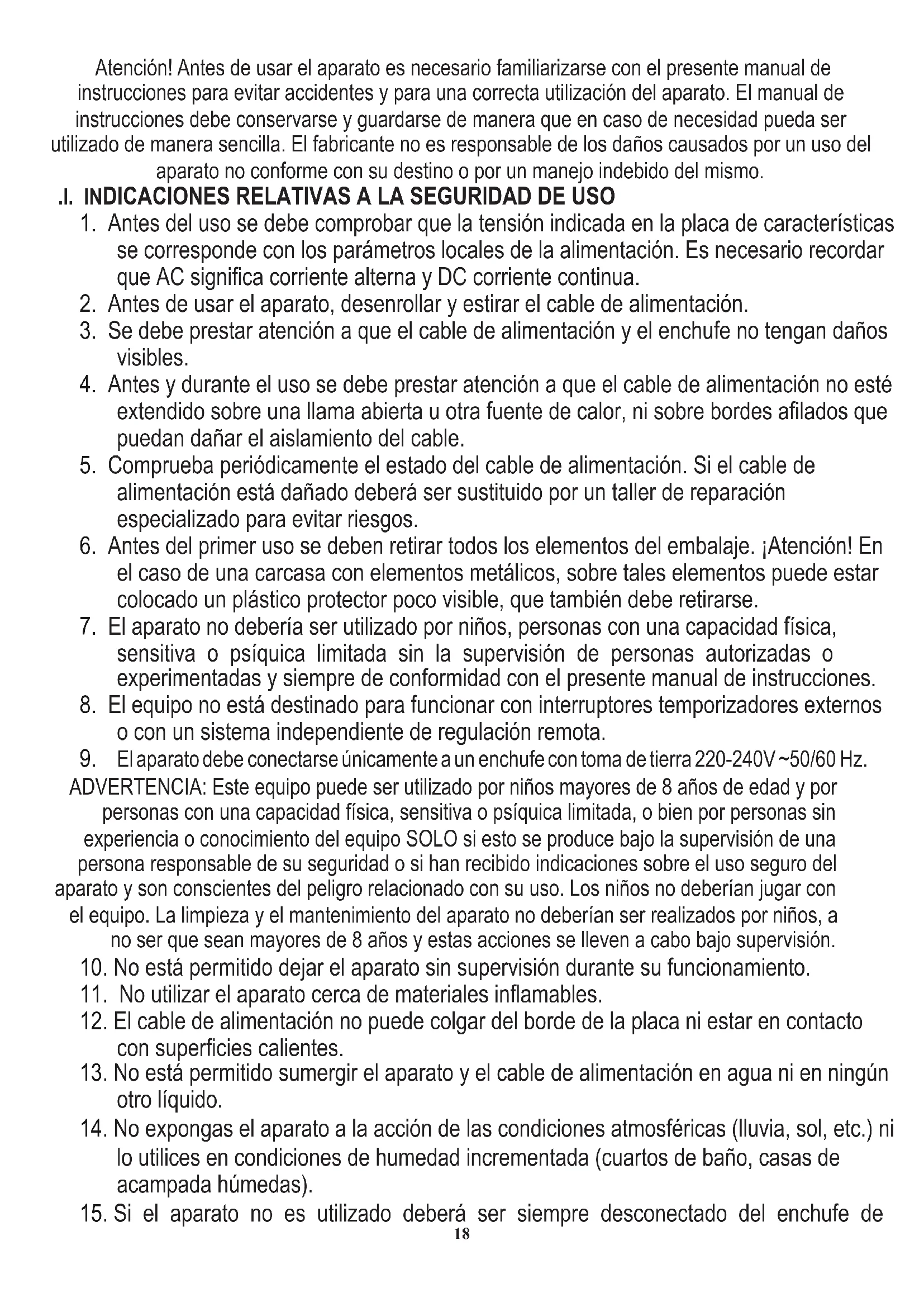 ADVERTENCIA: Este equipo puede ser utilizado por niños mayores de 8 años de edad y por personas con una capacidad física, sensitiva o psíquica limitada, o bien por personas sin experiencia o conocimiento del equipo SOLO si esto se produce bajo la supervisión de una persona responsable de su seguridad o si han recibido indicaciones sobre el uso seguro del aparato y son conscientes del peligro relacionado con su uso. Los niños no deberían jugar con el equipo. La limpieza y el mantenimiento del aparato no deberían ser realizados por niños, a no ser que sean mayores de 8 años y estas acciones se lleven a cabo bajo supervisión.