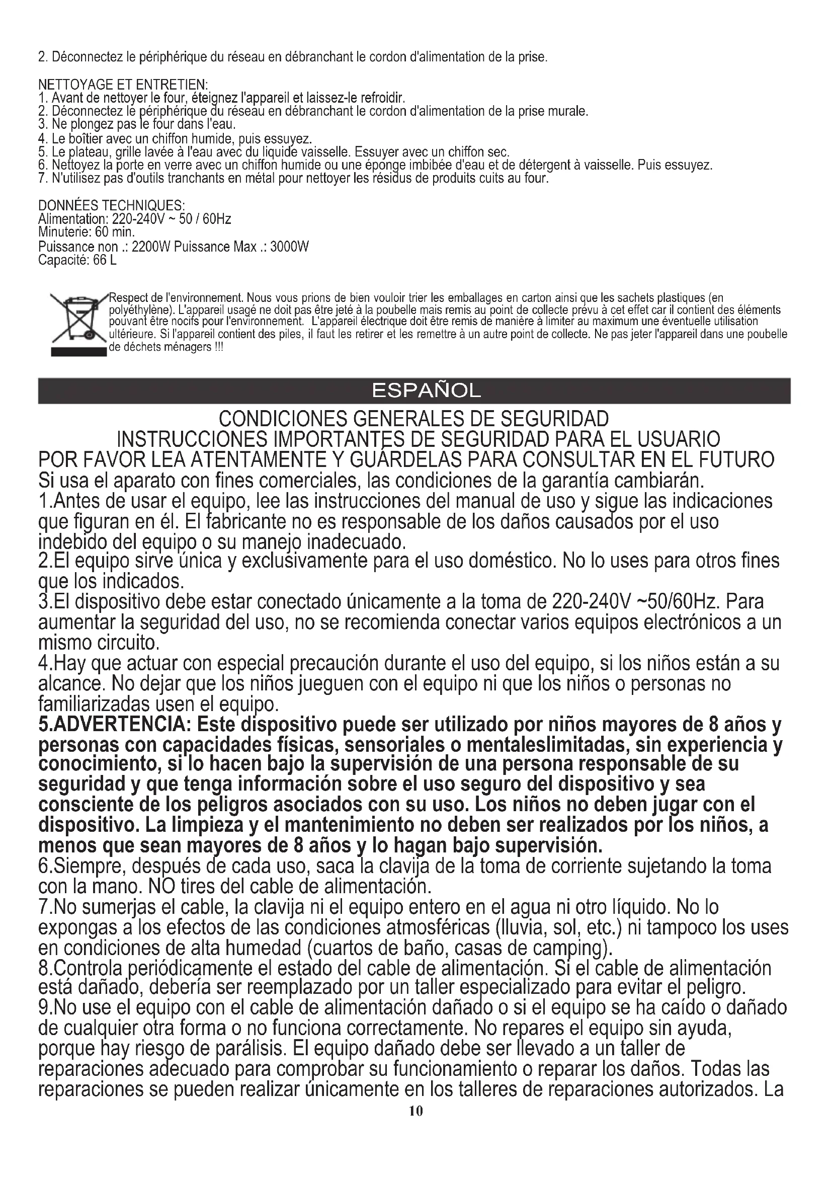 6. Nettoyez la porte en verre avec un chiffon humide ou une éponge imbibée d'eau et de détergent à vaisselle. Puis essuyez. DONNÉES TECHNIQUES: Respect de l'environnement. Nous vous prions de bien vouloir trier les emballages en carton ainsi que les sachets plastiques (en polyéthylène). L'appareil usagé ne doit pas être jeté à la poubelle mais remis au point de collecte prévu à cet effet car il contient des éléments pouvant être nocifs pour l'environnement. L'appareil électrique doit être remis de manière à limiter au maximum une éventuelle utilisation ultérieure. Si l'appareil contient des piles, il faut les retirer et les remettre à un autre point de collecte. Ne pas jeter l'appareil dans une poubelle de déchets ménagers !!! 8.Controla periódicamente el estado del cable de alimentación. Si el cable de alimentación está dañado, debería ser reemplazado por un taller especializado para evitar el peligro. 7.No sumerjas el cable, la clavija ni el equipo entero en el agua ni otro líquido. No lo expongas a los efectos de las condiciones atmosféricas (lluvia, sol, etc.) ni tampoco los uses en condiciones de alta humedad (cuartos de baño, casas de camping). 9.No use el equipo con el cable de alimentación dañado o si el equipo se ha caído o dañado de cualquier otra forma o no funciona correctamente. No repares el equipo sin ayuda, porque hay riesgo de parálisis. El equipo dañado debe ser llevado a un taller de reparaciones adecuado para comprobar su funcionamiento o reparar los daños. Todas las reparaciones se pueden realizar únicamente en los talleres de reparaciones autorizados. La 5.ADVERTENCIA: Este dispositivo puede ser utilizado por niños mayores de 8 años y personas con capacidades físicas, sensoriales o mentaleslimitadas, sin experiencia y conocimiento, si lo hacen bajo la supervisión de una persona responsable de su seguridad y que tenga información sobre el uso seguro del dispositivo y sea consciente de los peligros asociados con su uso. Los niños no deben jugar con el dispositivo. La limpieza y el mantenimiento no deben ser realizados por los niños, a menos que sean mayores de 8 años y lo hagan bajo supervisión. 3.El dispositivo debe estar conectado únicamente a la toma de 220-240V ~50/60Hz. Para aumentar la seguridad del uso, no se recomienda conectar varios equipos electrónicos a un mismo circuito. 4.Hay que actuar con especial precaución durante el uso del equipo, si los niños están a su alcance. No dejar que los niños jueguen con el equipo ni que los niños o personas no familiarizadas usen el equipo. 6.Siempre, después de cada uso, saca la clavija de la toma de corriente sujetando la toma con la mano. NO tires del cable de alimentación. INSTRUCCIONES IMPORTANTES DE SEGURIDAD PARA EL USUARIO POR FAVOR LEA ATENTAMENTE Y GUÁRDELAS PARA CONSULTAR EN EL FUTURO Si usa el aparato con fines comerciales, las condiciones de la garantía cambiarán.