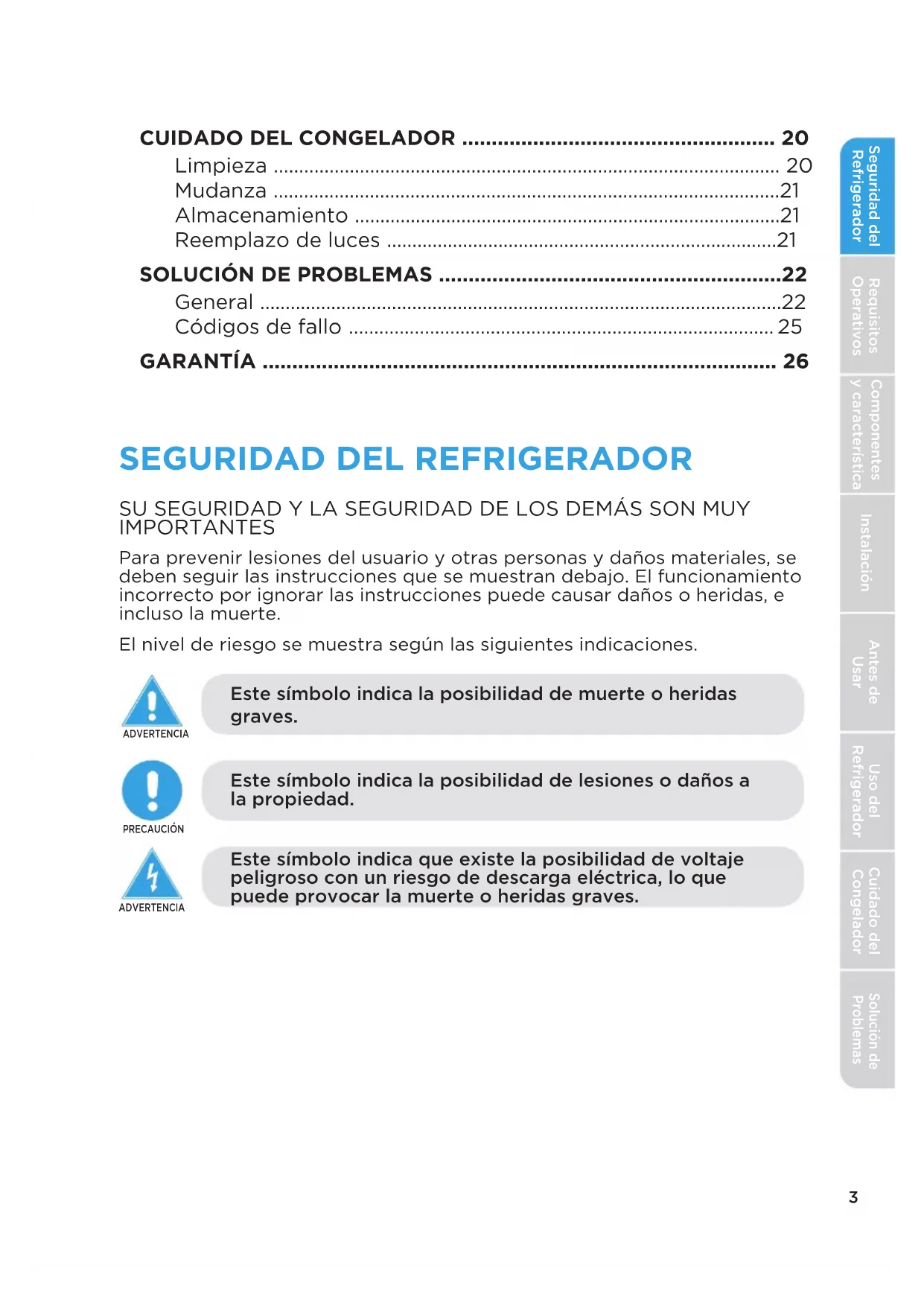 SU SEGURIDAD Y LA SEGURIDAD DE LOS DEMÁS SON MUY IMPORTANTES Para prevenir lesiones del usuario y otras personas y daños materiales, se deben seguir las instrucciones que se muestran debajo. El funcionamiento incorrecto por ignorar las instrucciones puede causar daños o heridas, e incluso la muerte. El nivel de riesgo se muestra según las siguientes indicaciones. PRECAUCIÓNADVERTENCIA ADVERTENCIA Este símbolo indica que existe la posibilidad de voltaje peligroso con un riesgo de descarga eléctrica, lo que puede provocar la muerte o heridas graves. Este símbolo indica la posibilidad de lesiones o daños a la propiedad. Este símbolo indica la posibilidad de muerte o heridas graves.4 Seguridad del RefrigeradorRequisitos Operativos Componentesy característicaInstalaciónUso del RefrigeradorCuidado del CongeladorSolución de ProblemasAntes de Usar