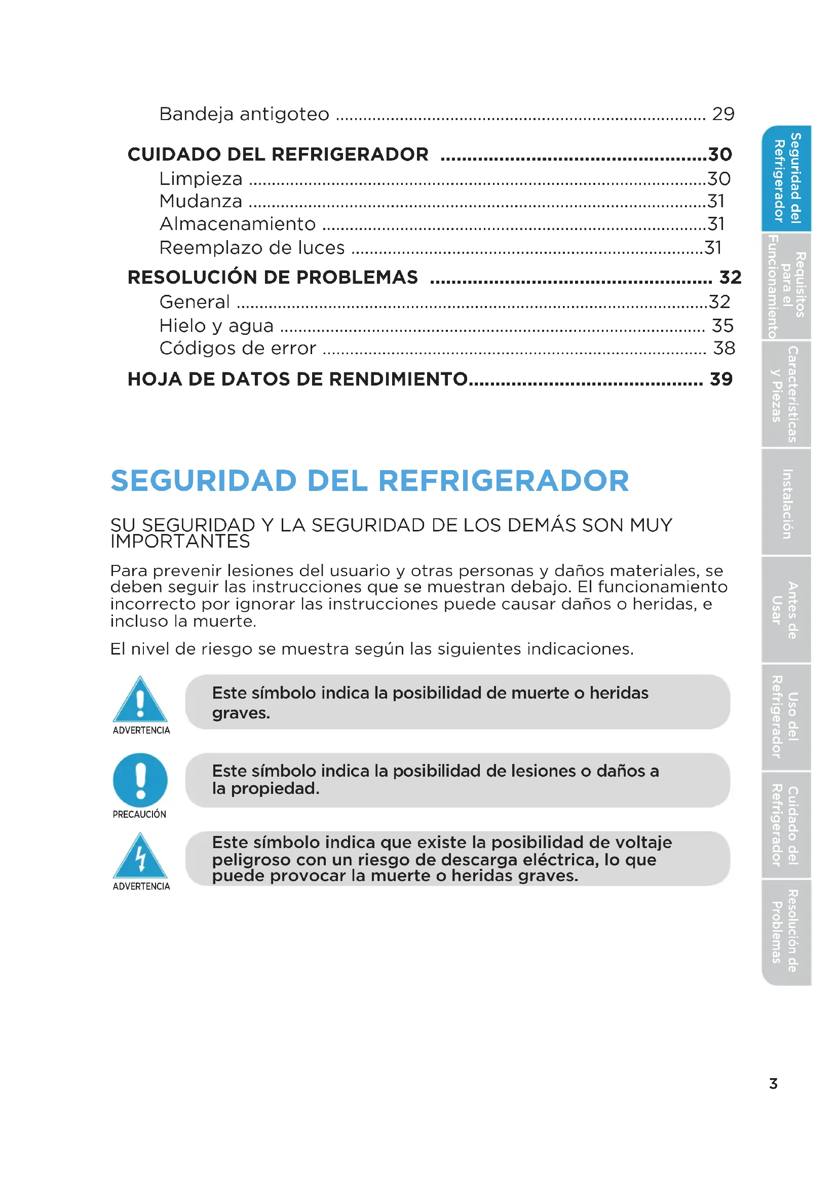 Requisitos para el Funcionamiento Características y Piezas Instalación Uso del Refrigerador Cuidado del Refrigerador Resolución de Problemas Antes de Usar Seguridad del Refrigerador28