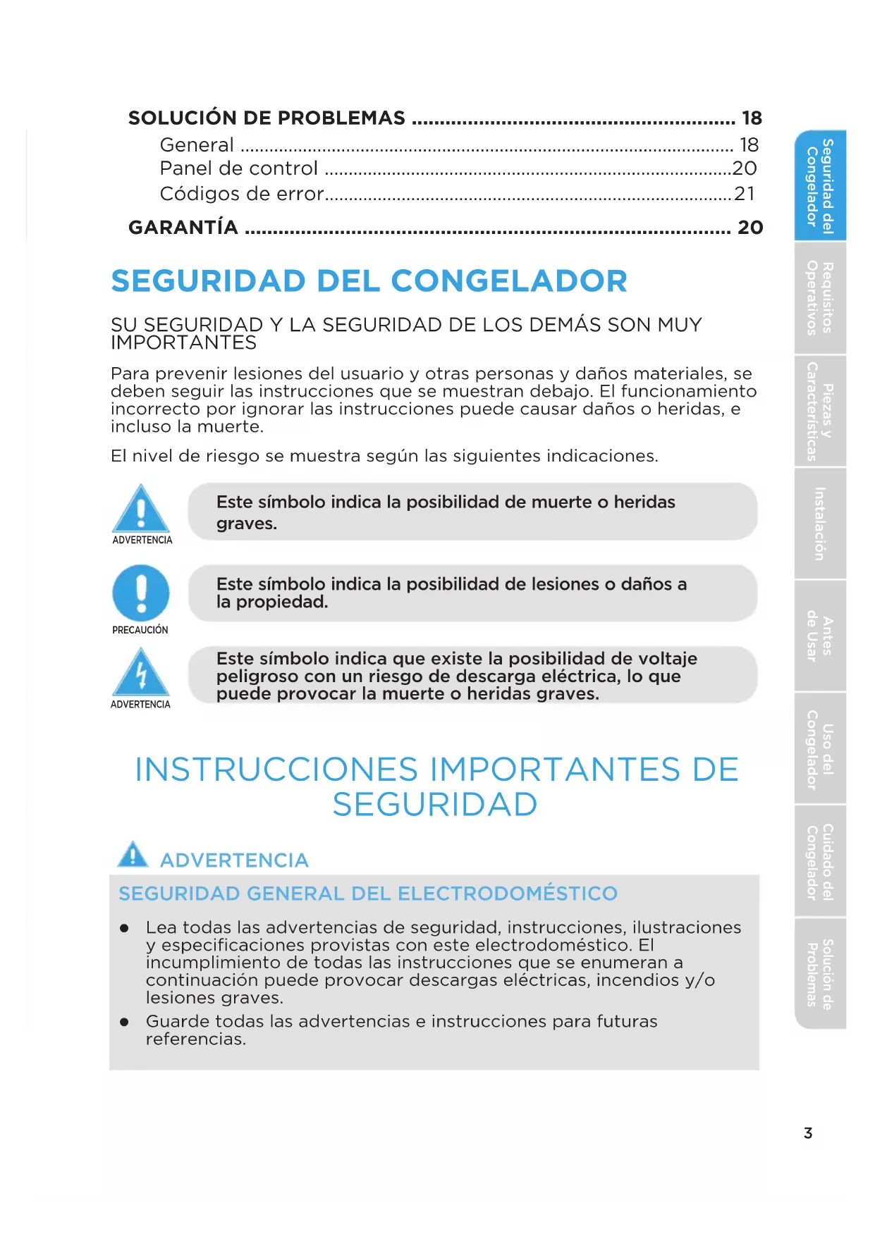 Seguridad del CongeladorRequisitos OperativosPiezas y CaracterísticasInstalaciónUso del CongeladorCuidado del CongeladorSolución de ProblemasAntes de Usar